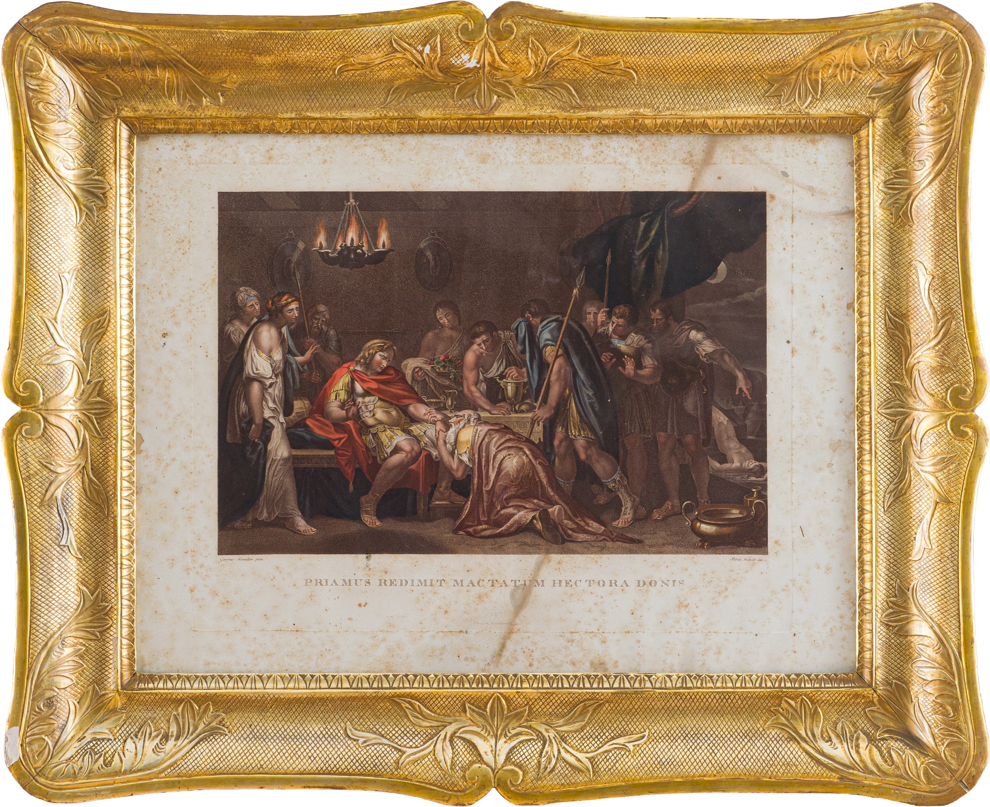 Cornice a guantiera in legno dorato ad argento e mistura con all'interno stampa raffigurante "Priamo riscatta il cadavere di Ettore".