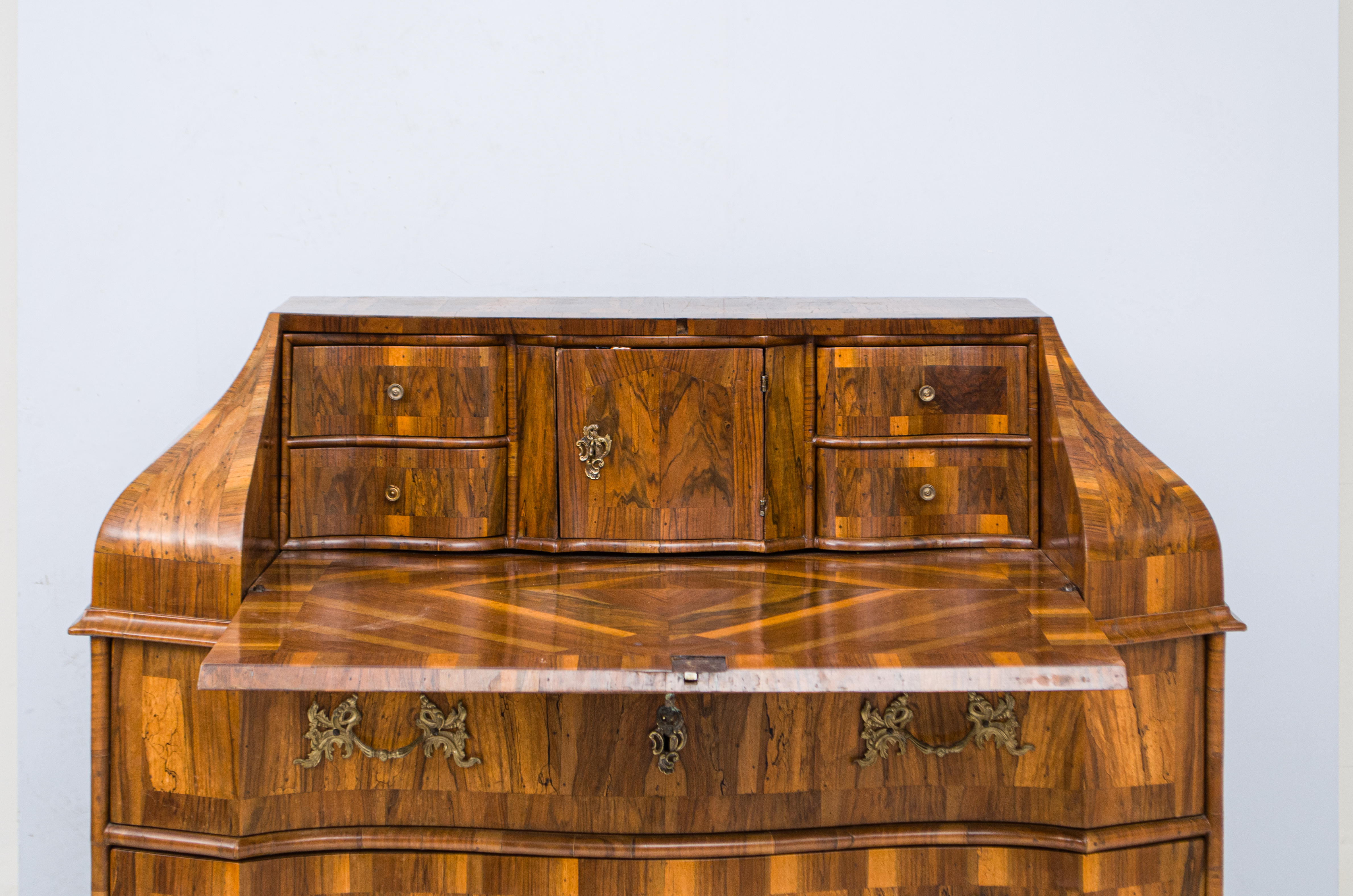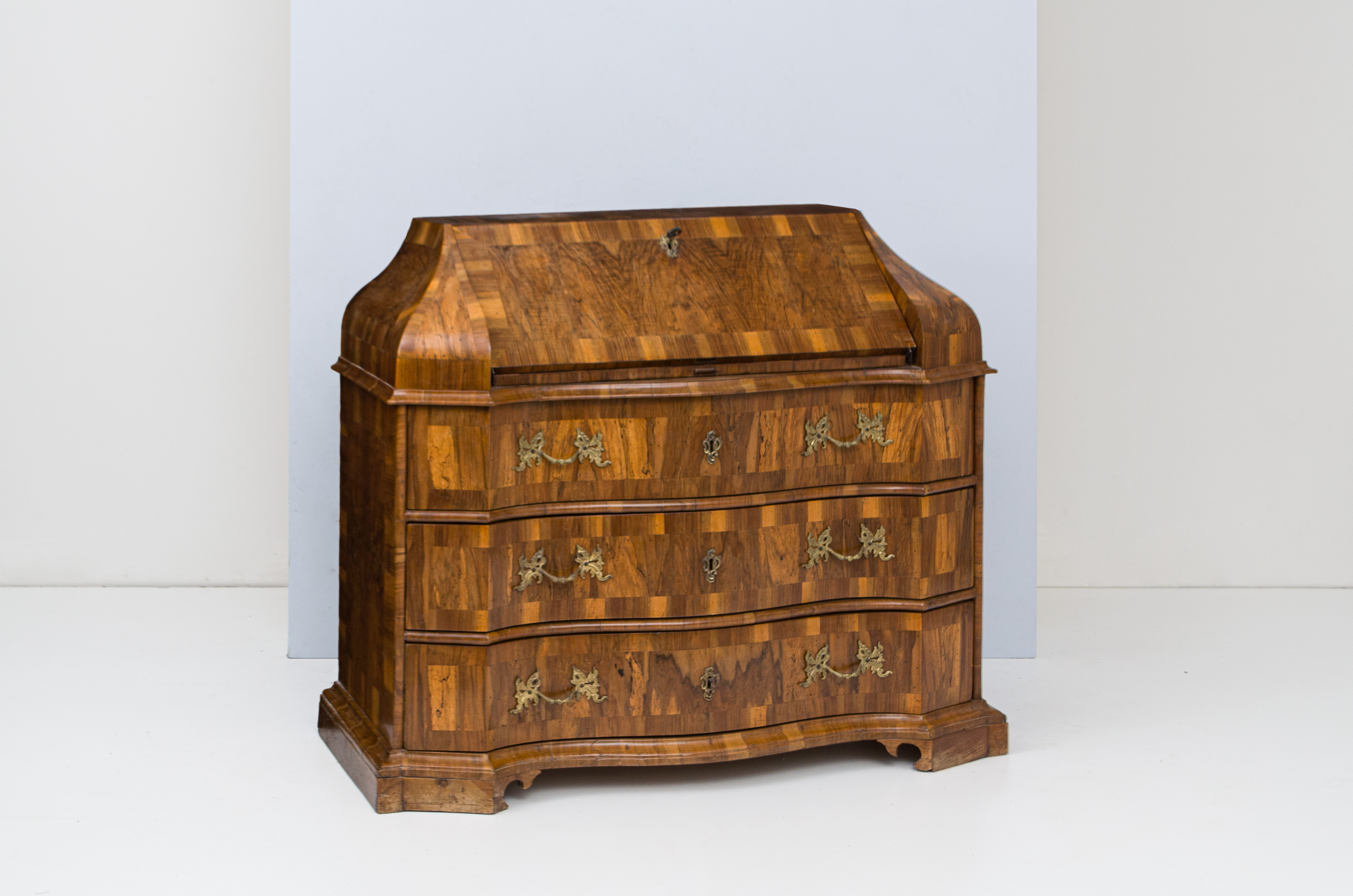 Ribalta lastronata in legno di noce con tre cassetti, piano a ribalta con cassettiera all'interno.