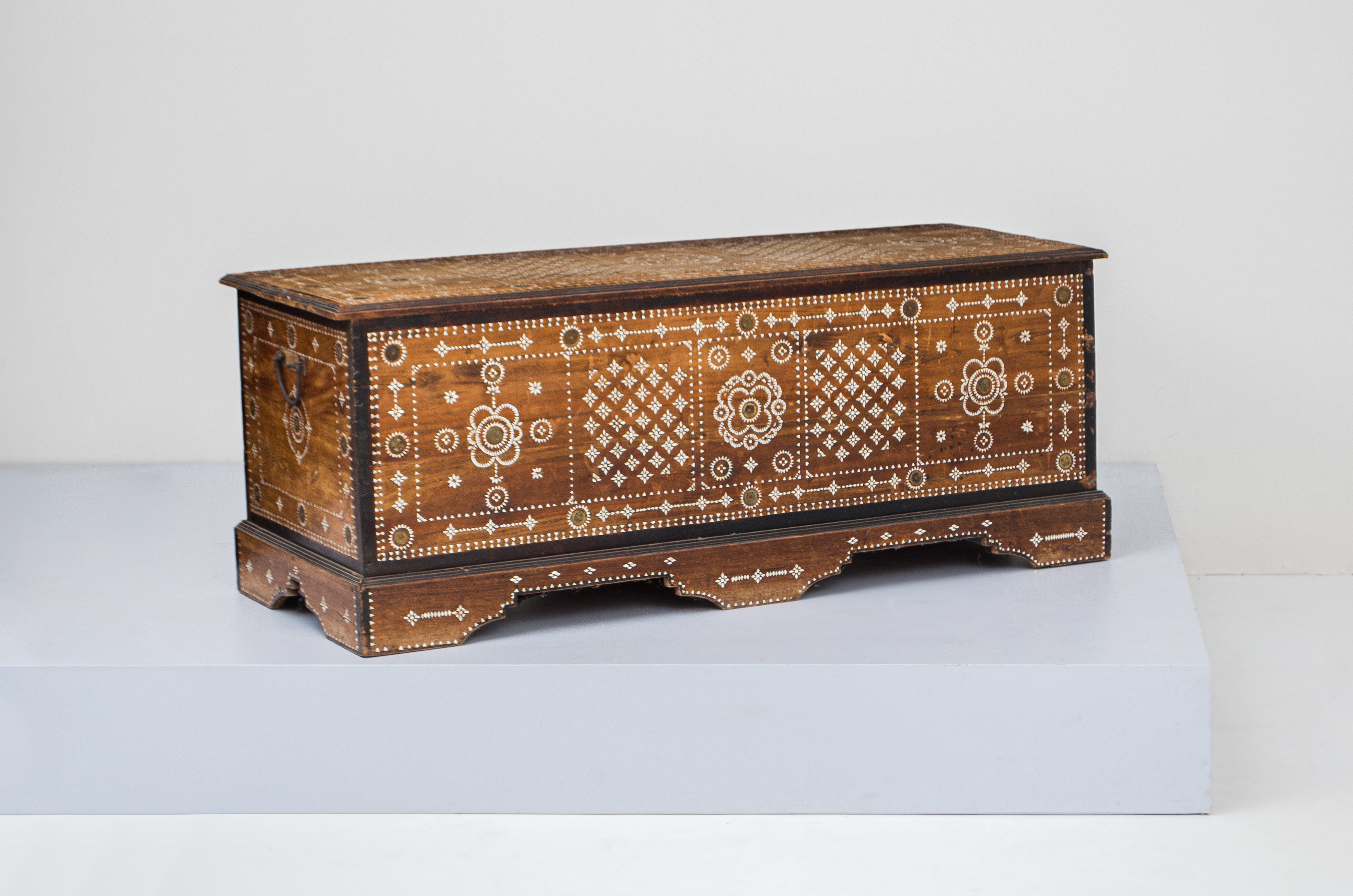 Cassapanca in legno esotico riccamente intarsiato con madreperla a disegno geometrico.