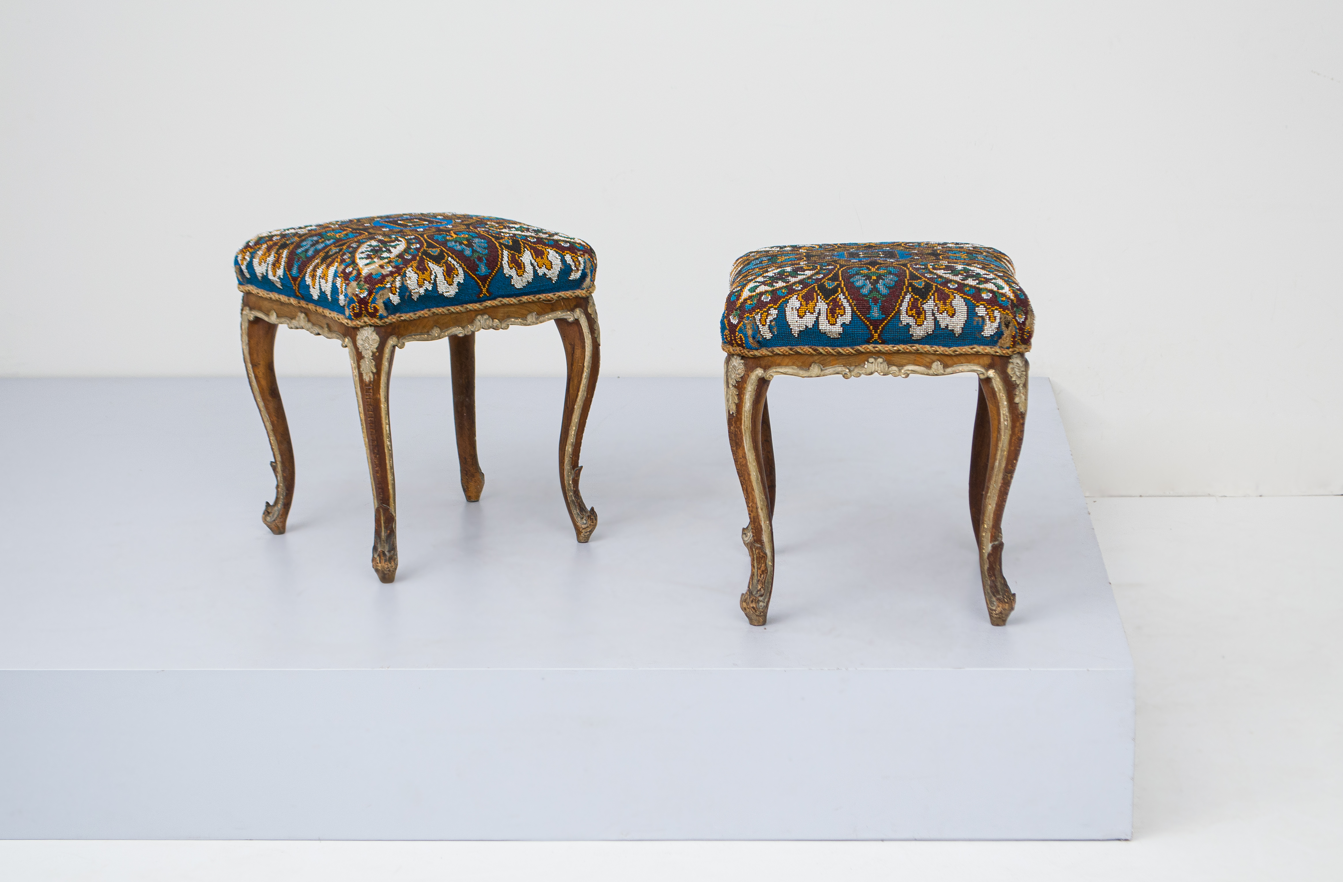 Coppia di sgabelli Luigi XV in legno laccato, seduta imbottita con tessuto ricamato con perline.