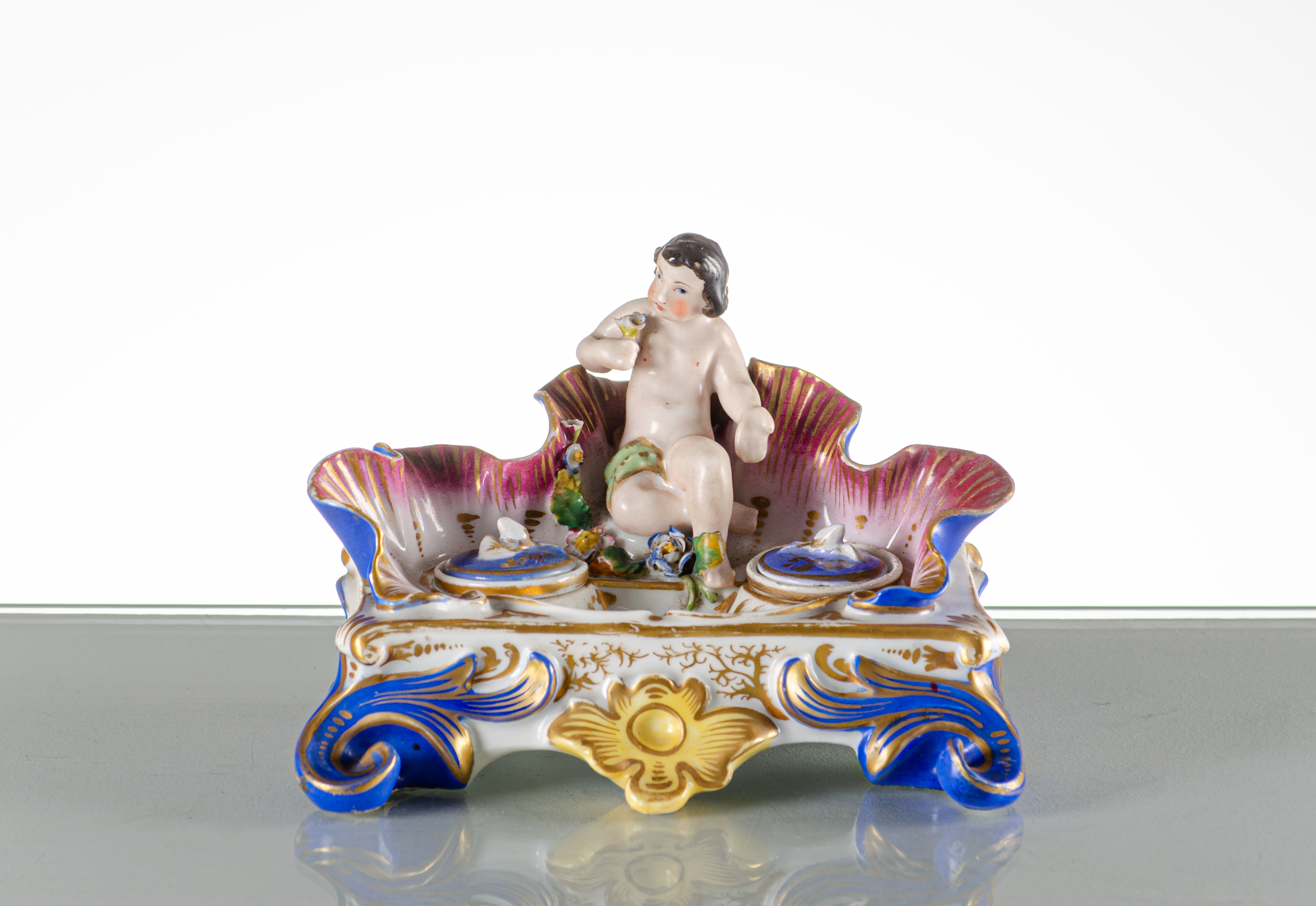 Calamaio in porcellana smaltata e lumeggiata ad oro zecchino con al centro putto