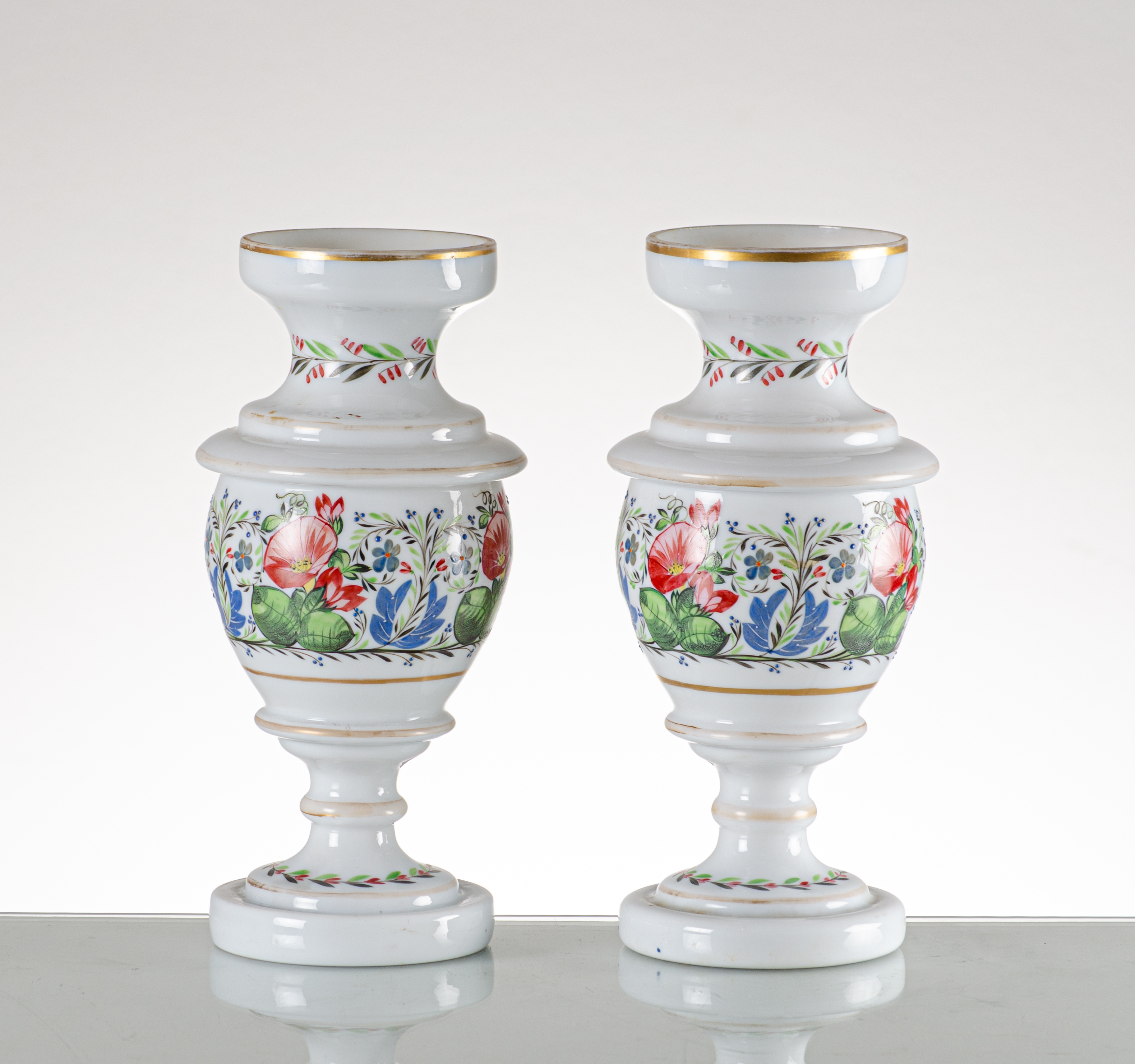 Coppia di vasi in opaline smaltati con decori a motivi floreali e lumeggiati ad oro zecchino.