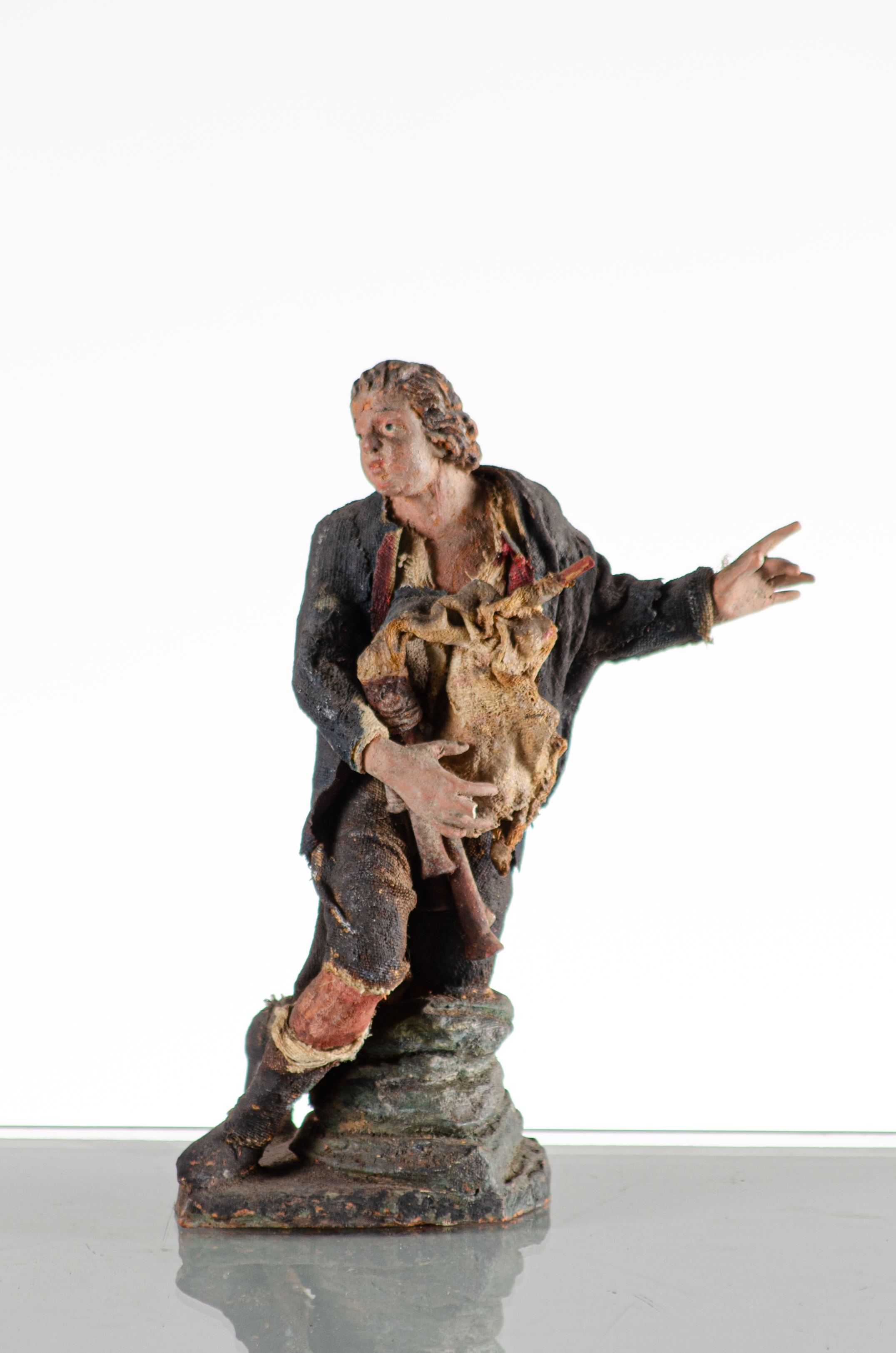 Scultura raffigurante "Pastore da presepe con cornamusa" in cartapesta, stracci e terracotta policroma (usure e restauri).