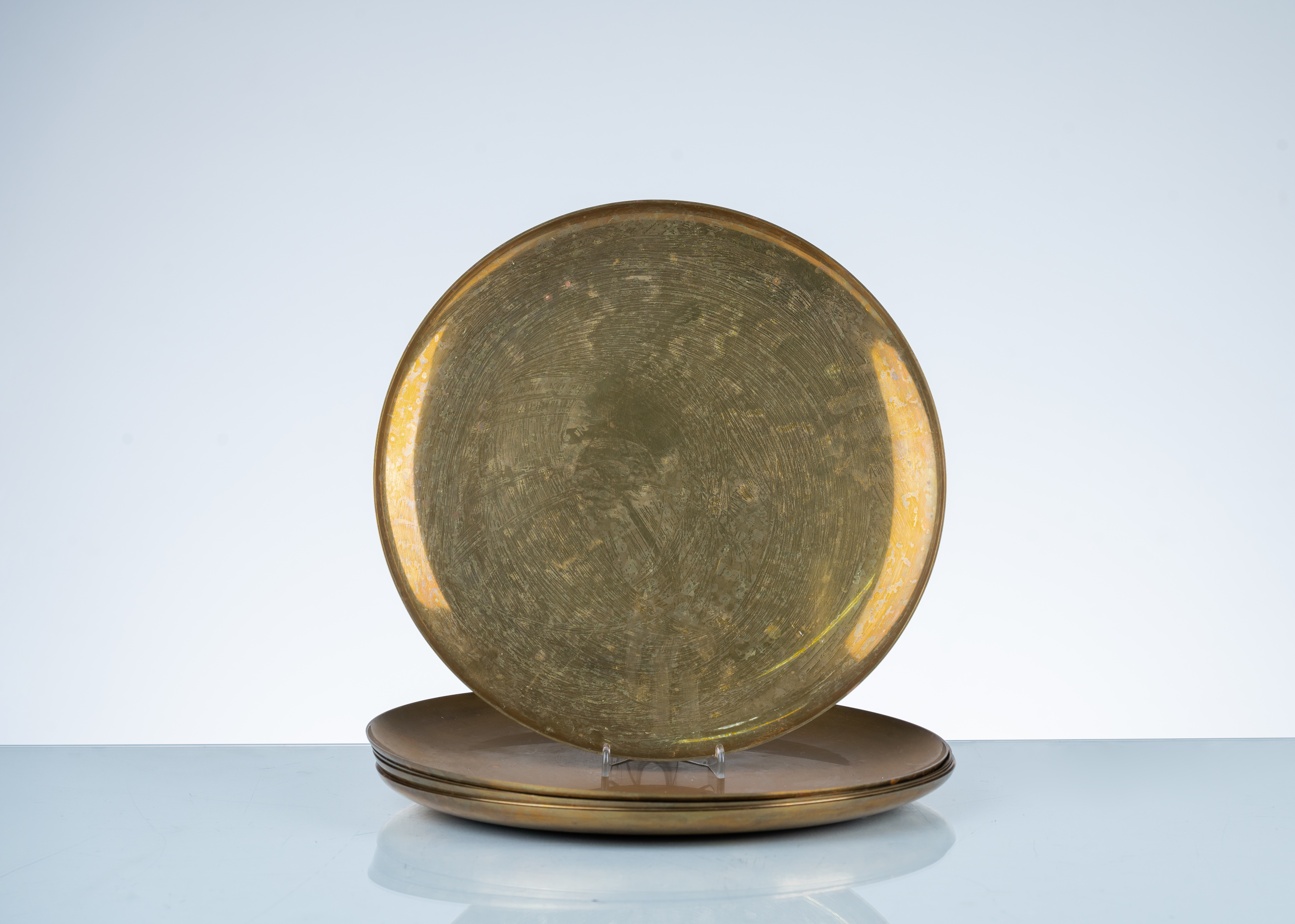 Sei piatti circolari in ottone. Segni d’uso. Firma retrostante.