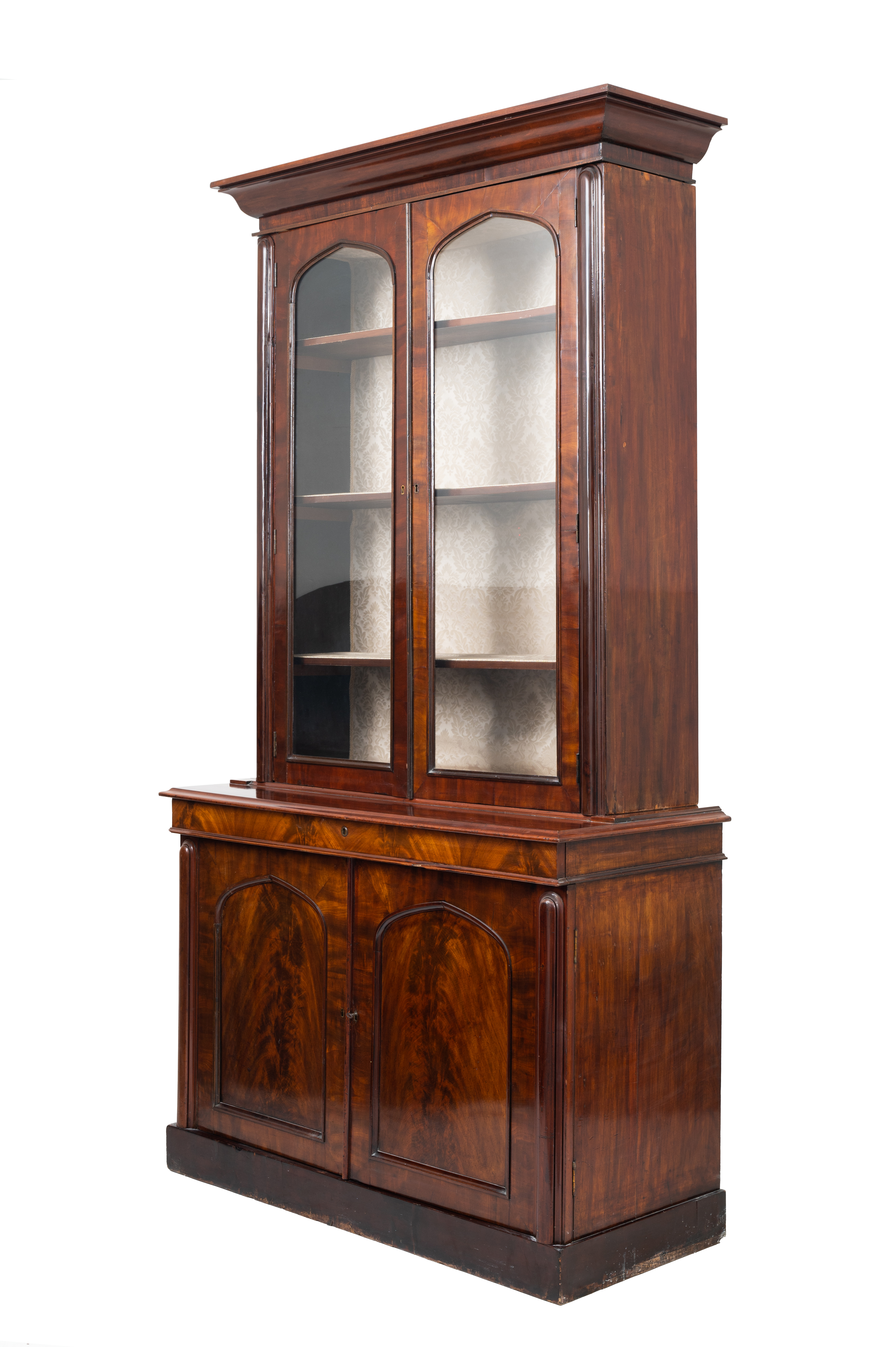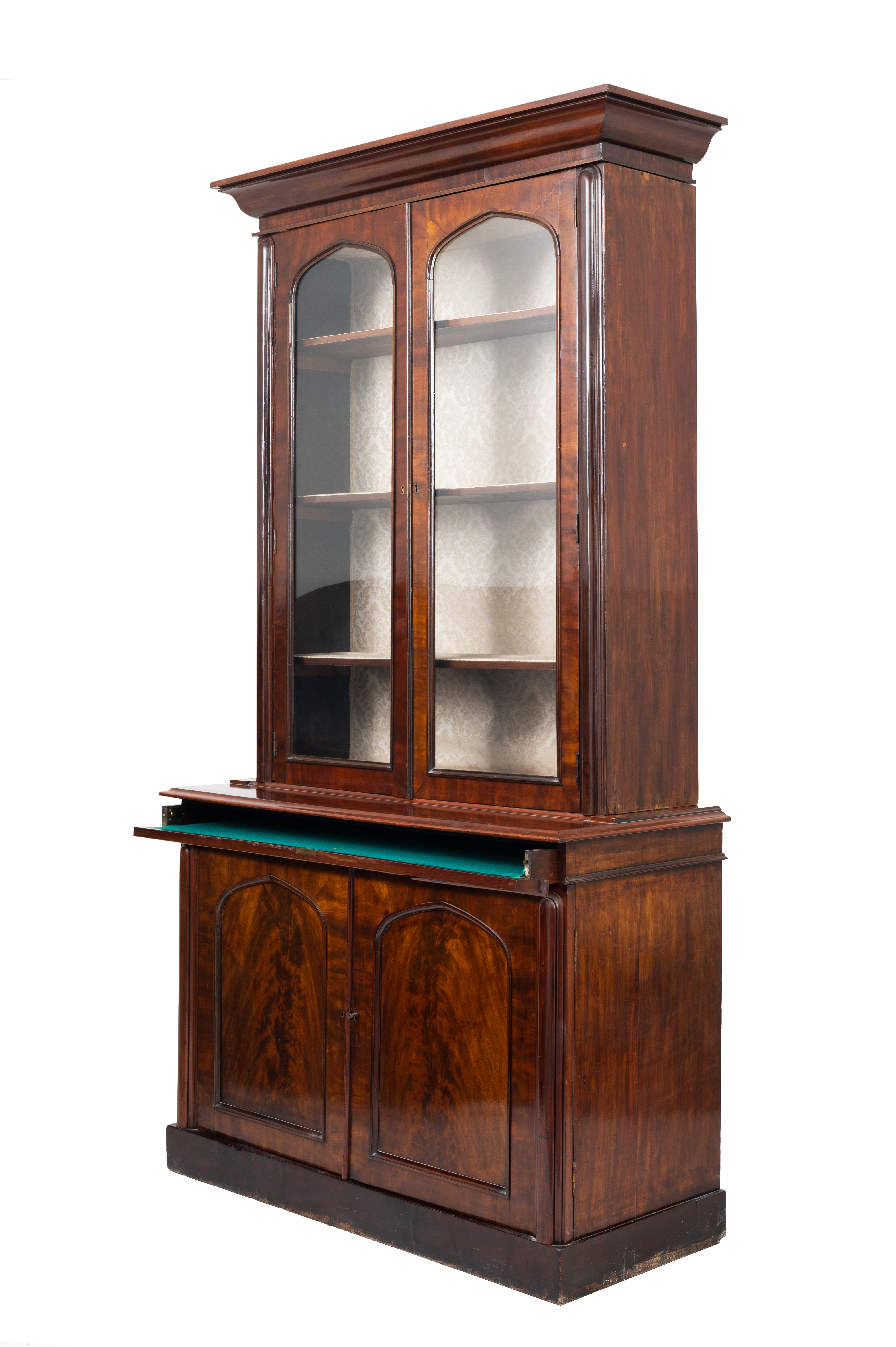 Libreria doppio corpo in legno di mogano e piuma di mogano, periodo Vittoriano.