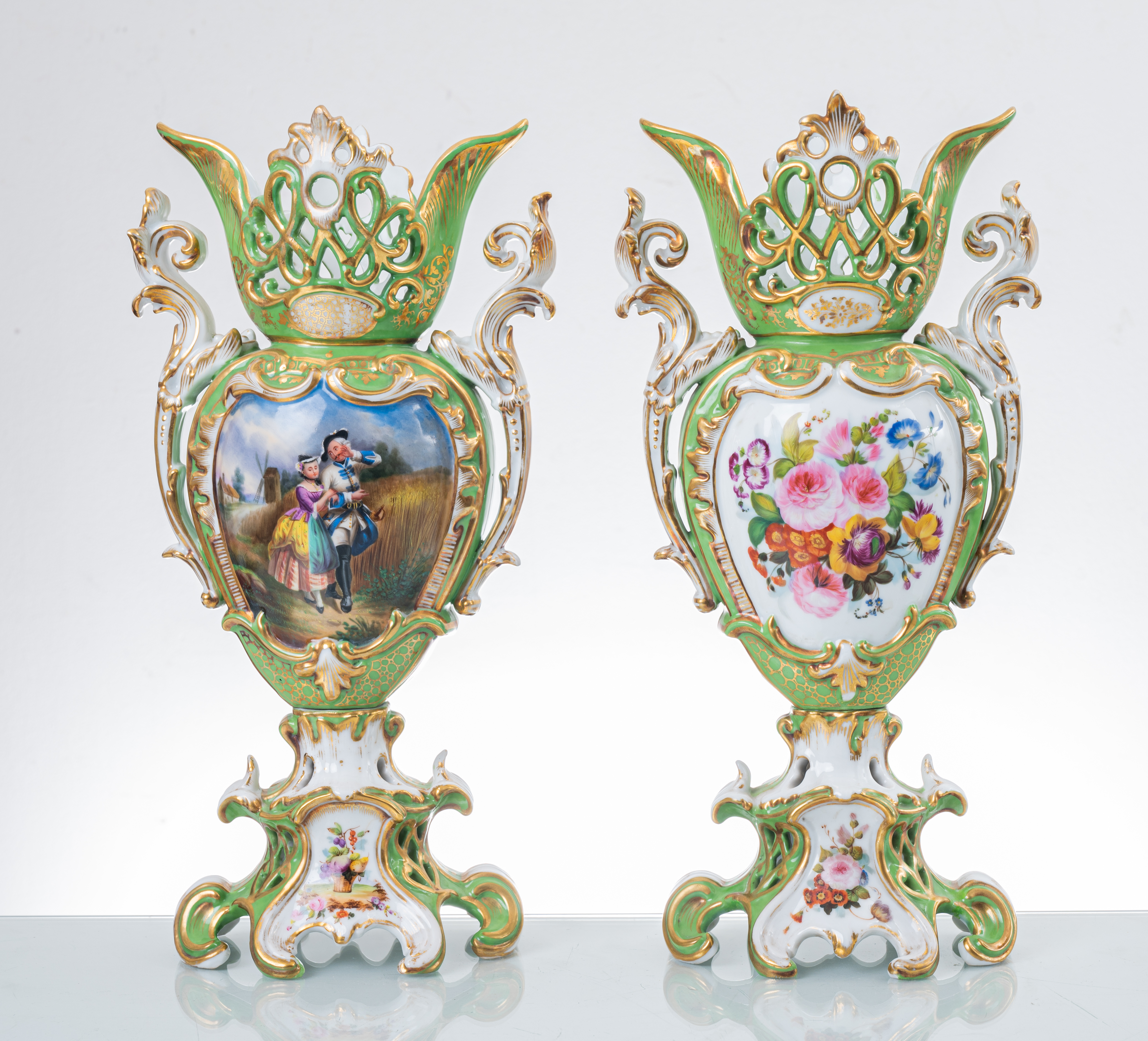 Coppia di vasi Luigi Filippo in porcellana decorata e dipinta nei toni del verde, medaglioni raffiguranti da un lato "Scena galante" e dall'altro "Fiori", lumeggiature in oro (piccole usure).