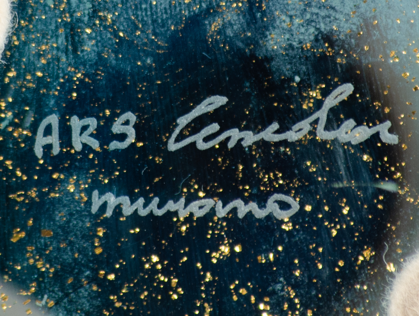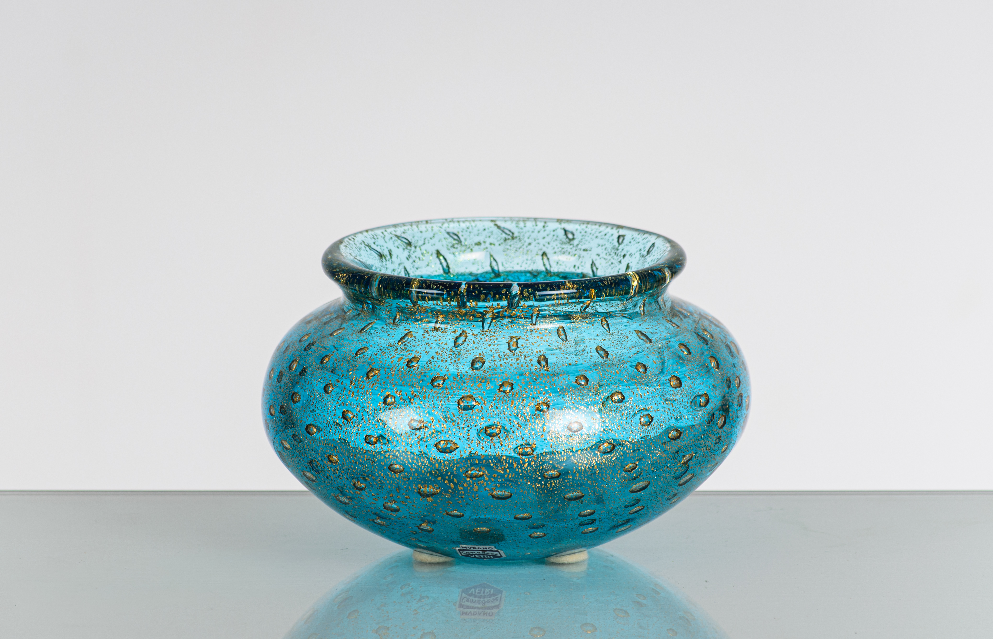 Vaso in vetro sommerso bullicante azzurrino con inclusioni oro, corpo ovalizzato con bocca circolare estroflessa e piana. Firma a graffio ed etichetta.
