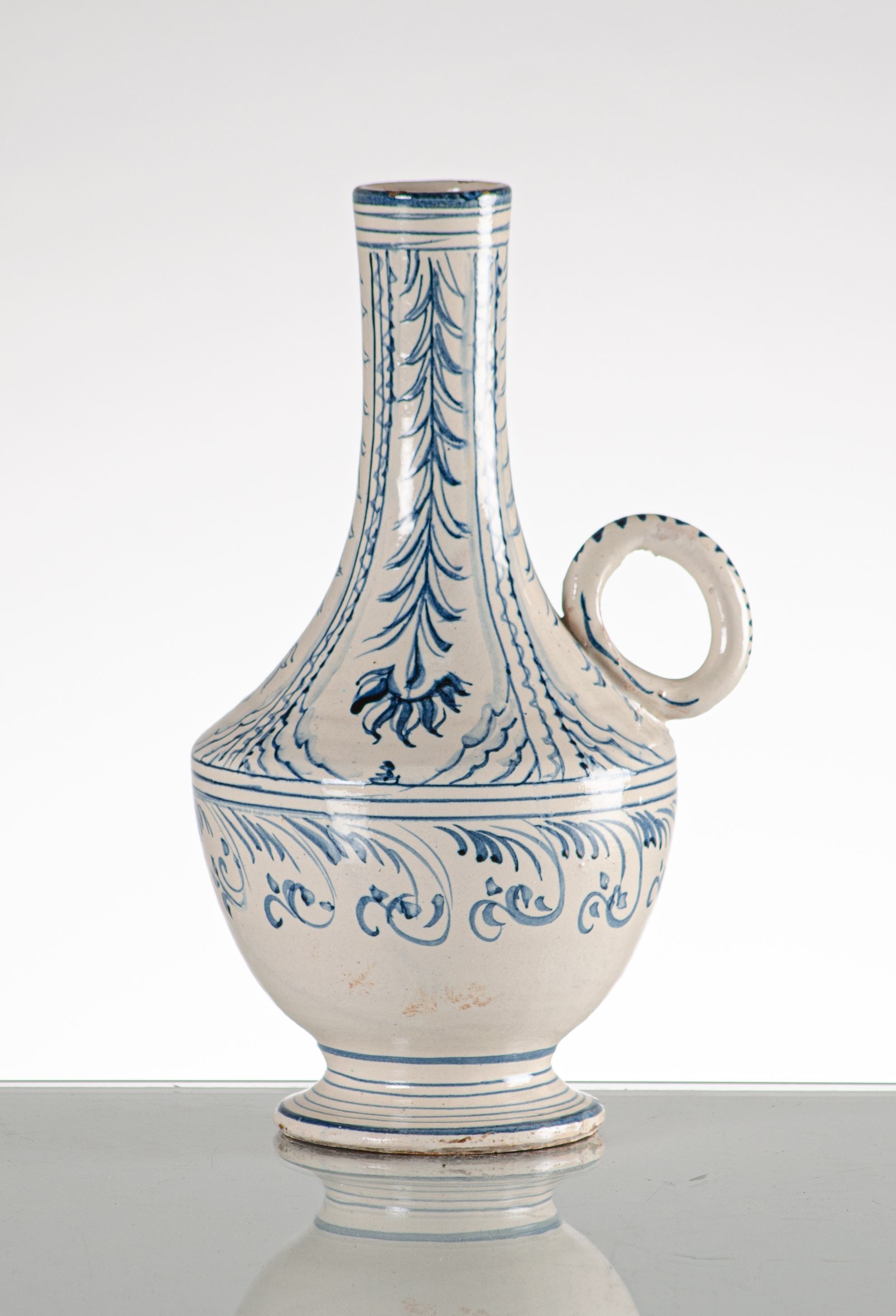 Bottiglia in maiolica biansata con decorazioni nei toni del blu.