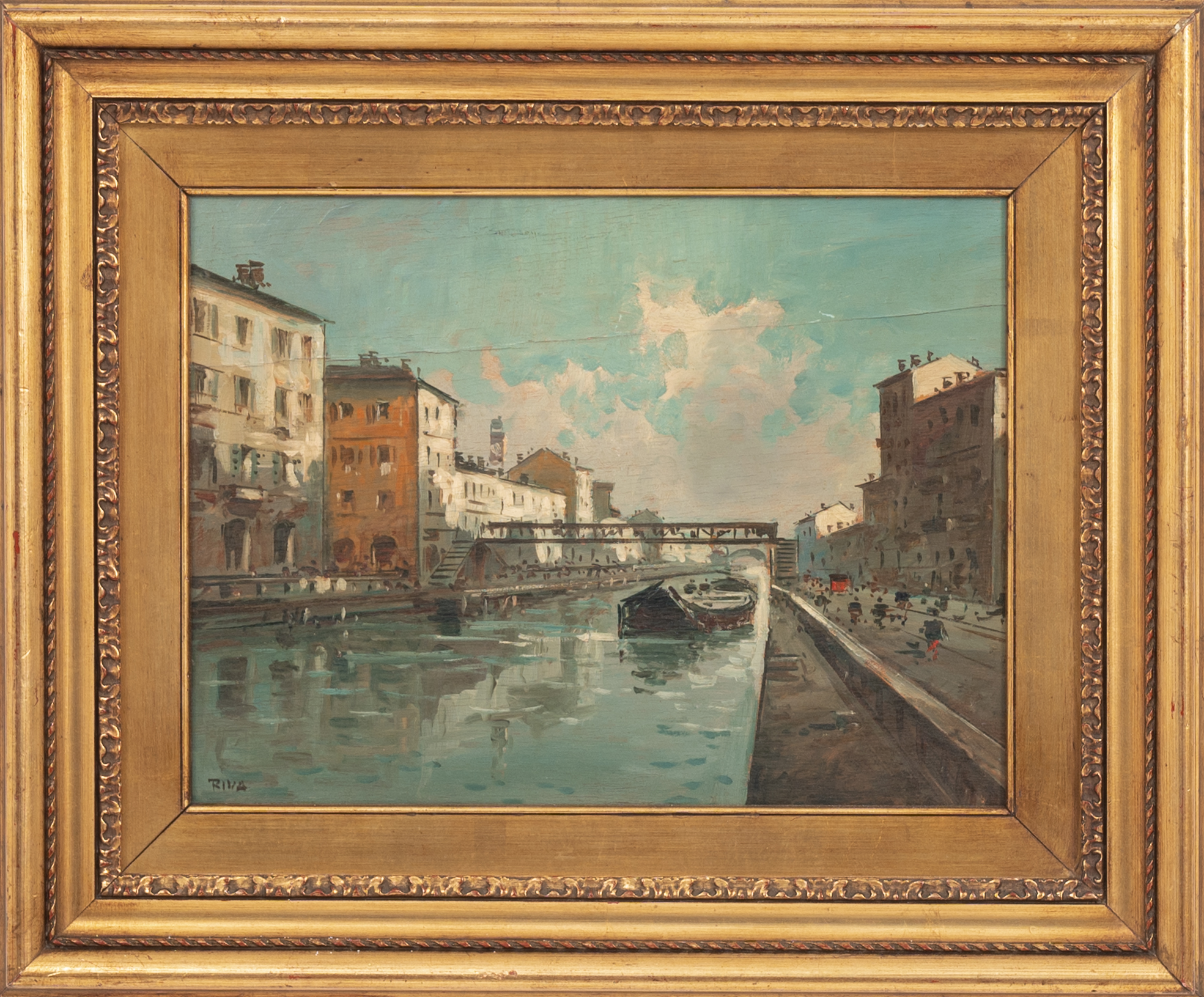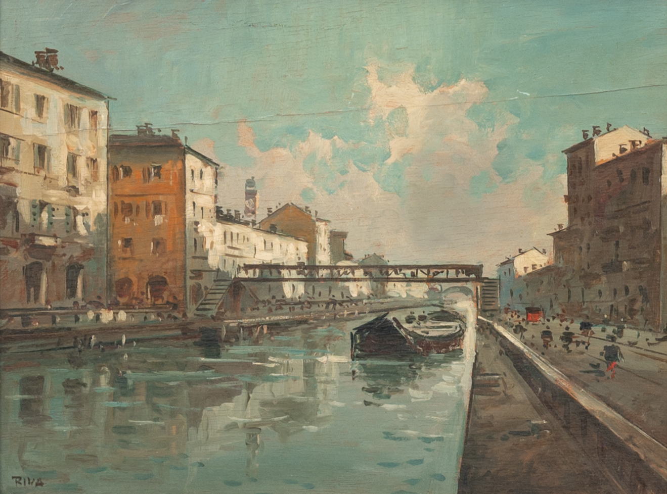 GIUSEPPE RIVA, Naviglio, Olio su tavola
