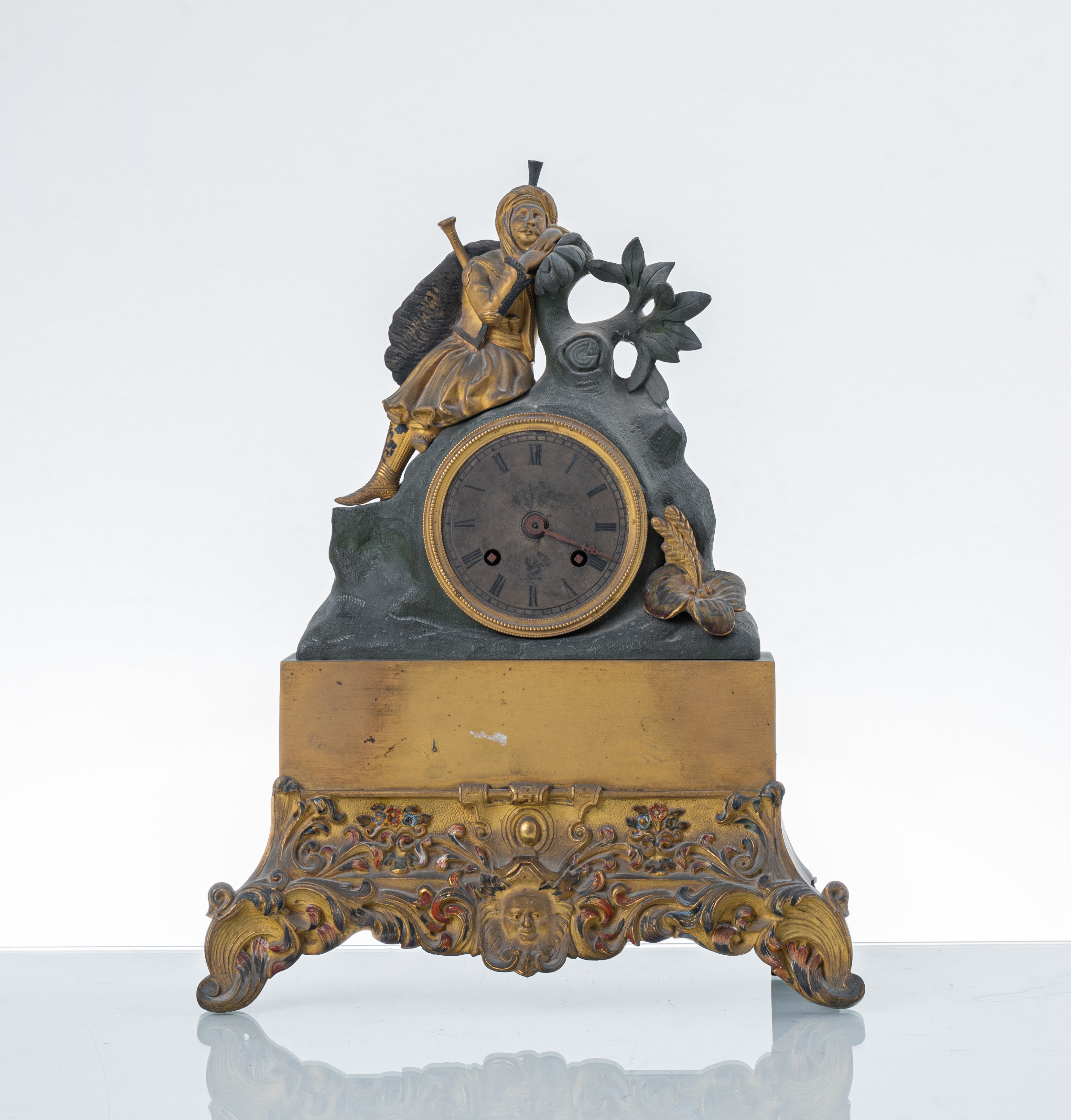 Orologio da tavolo in bronzo dorato con scultura raffigurante "Figura maschile" (usure, mancanze ed un piede posteriore mancante).