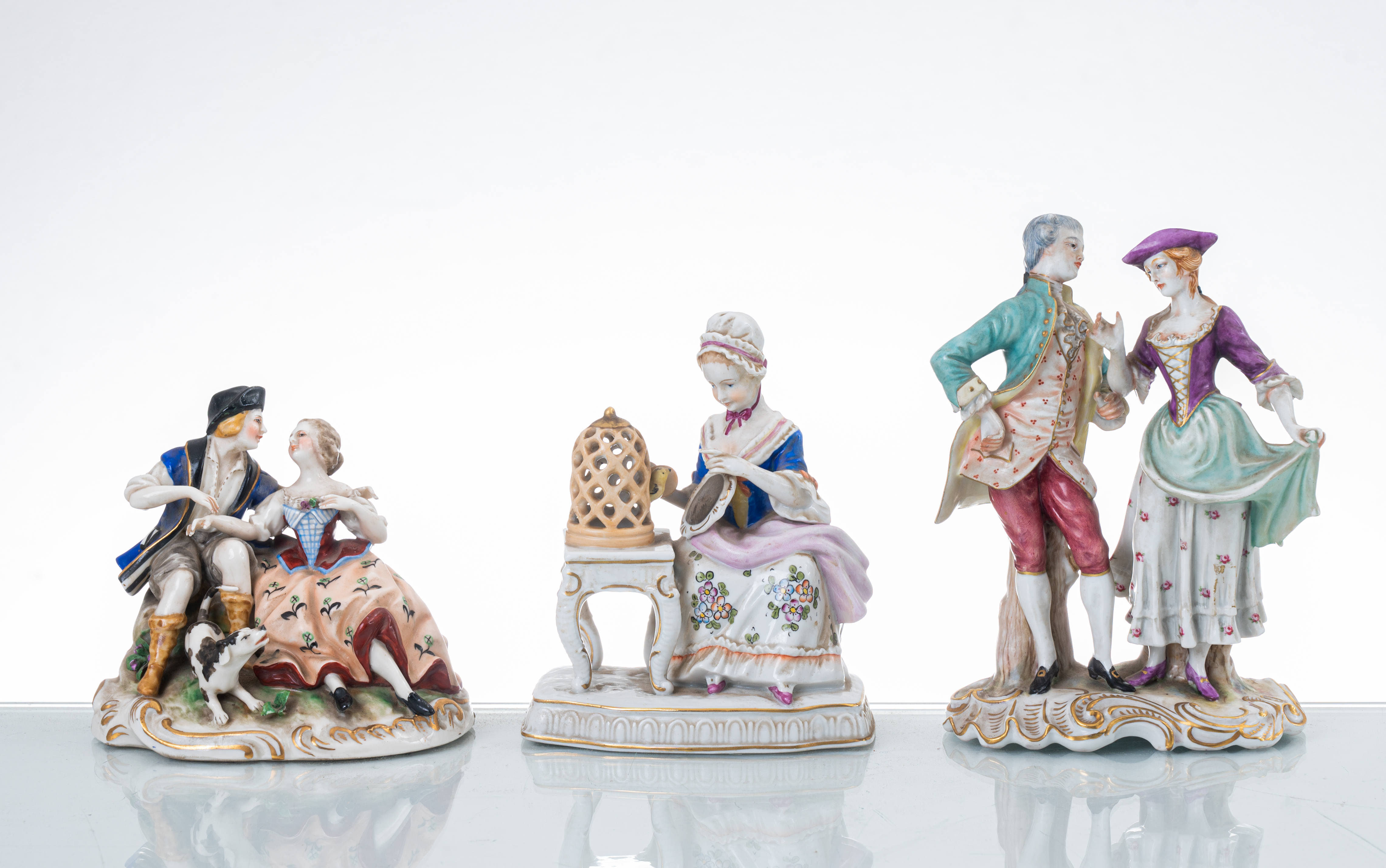 Tre sculture in porcellana policroma decorata raffiguranti "Soggetti vari" (usure).