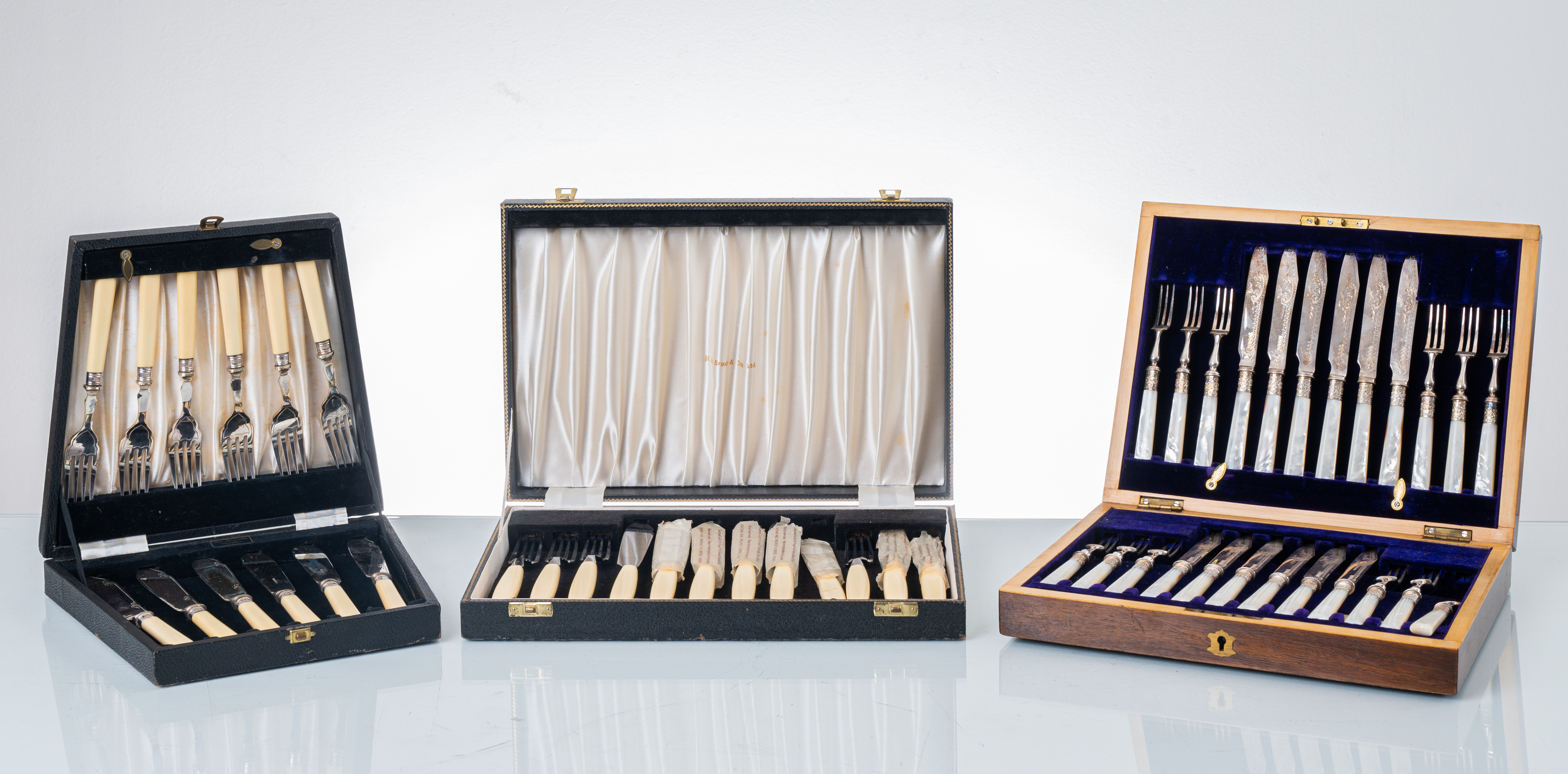 Due scatole in legno contenente sei piccole forchette e sei piccoli coltelli con manici in osso e sheffield e scatola in legno contenente dodici piccole forchette e dodici piccoli coltelli con manici in madreperla e sheffield.