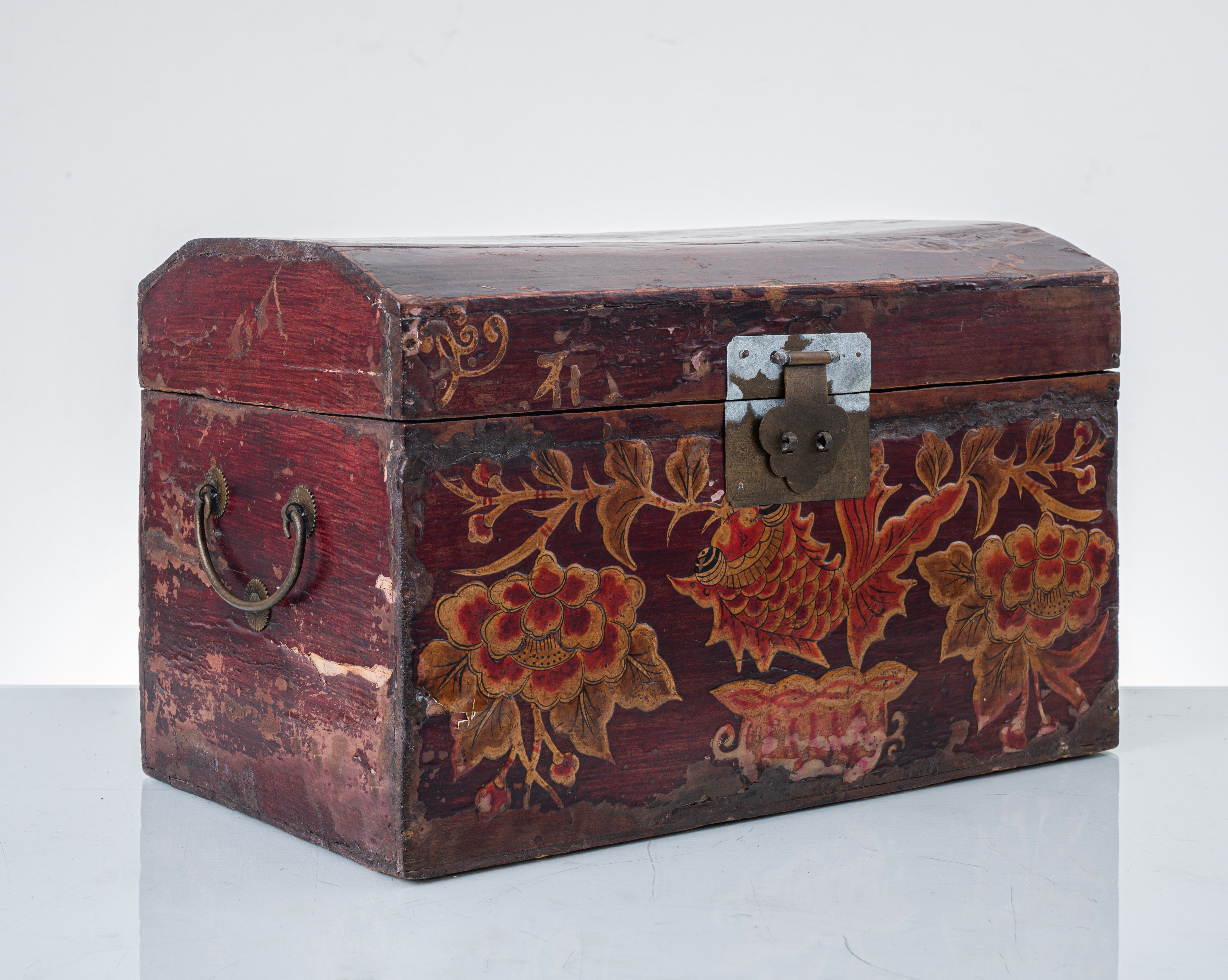 Piccolo baule in legno laccato e dipinto (usure).