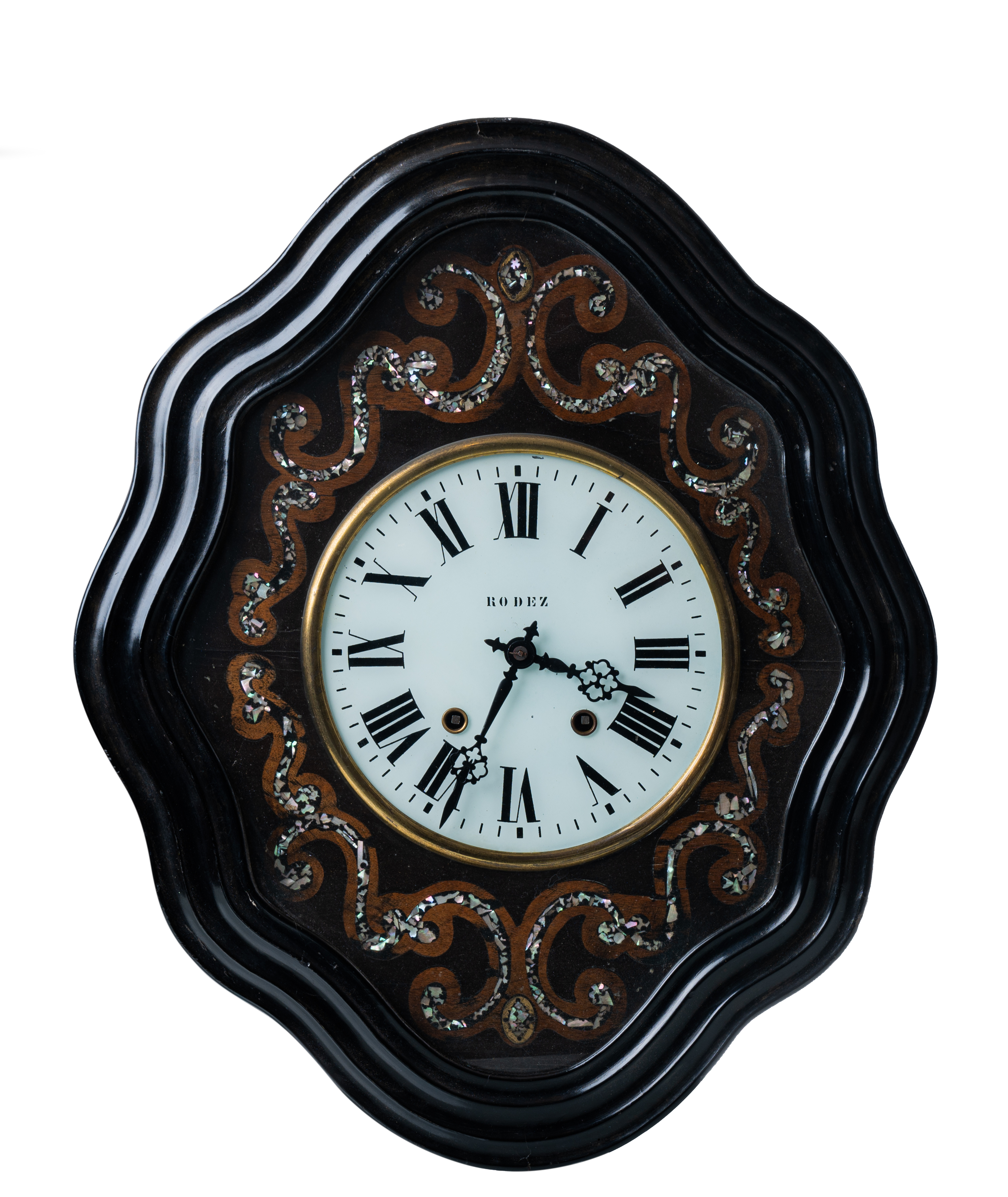 Orologio occhio di bue in legno ebanizzato, riccamente intarsiato in vari legni e madreperla, quadrante con numeri romani.