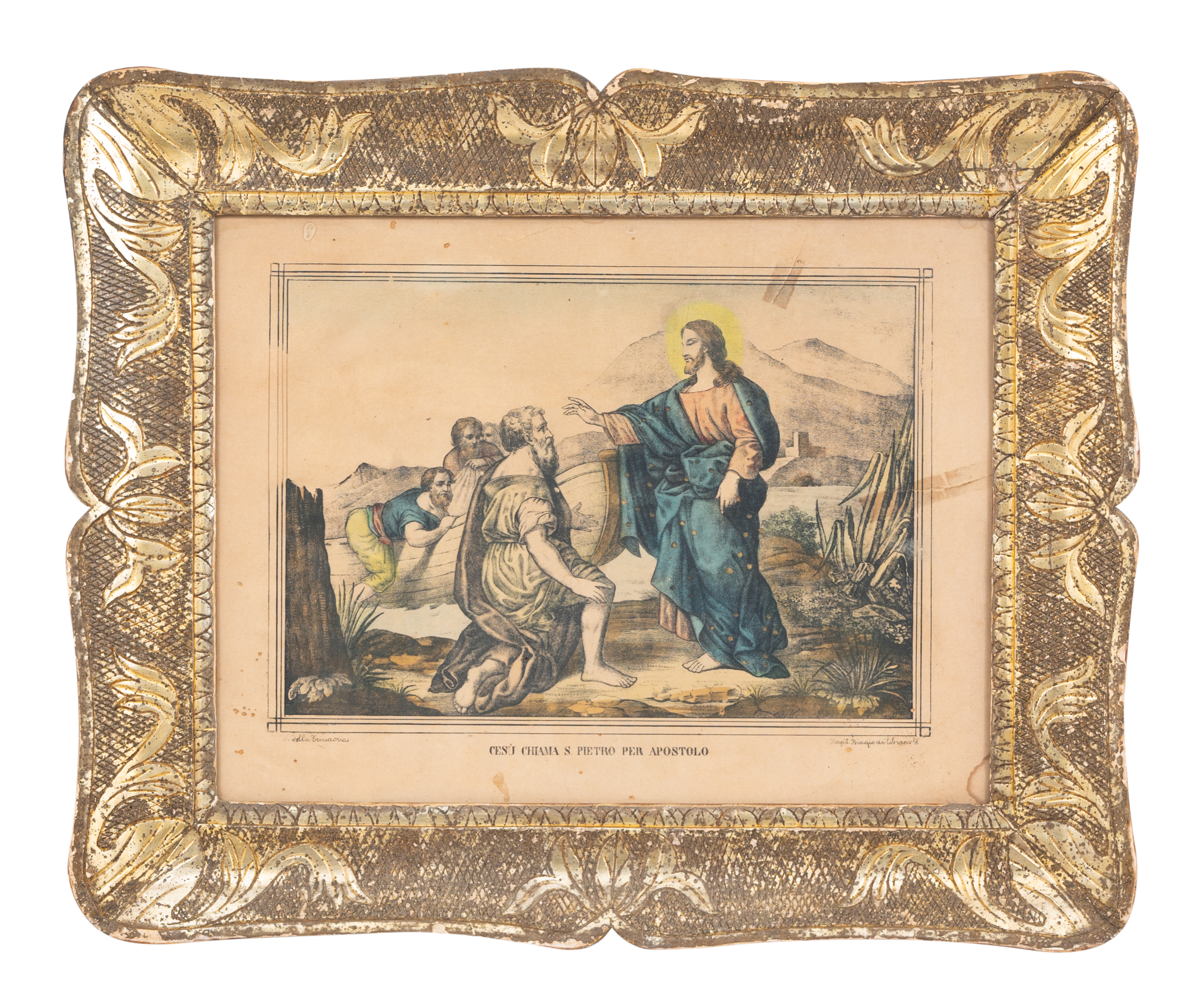 Cornice a vassoio in legno dorato ad argento e mistura, con all'interno incisione a colori raffigurante "Gesù chiama San Pietro per apostolo".