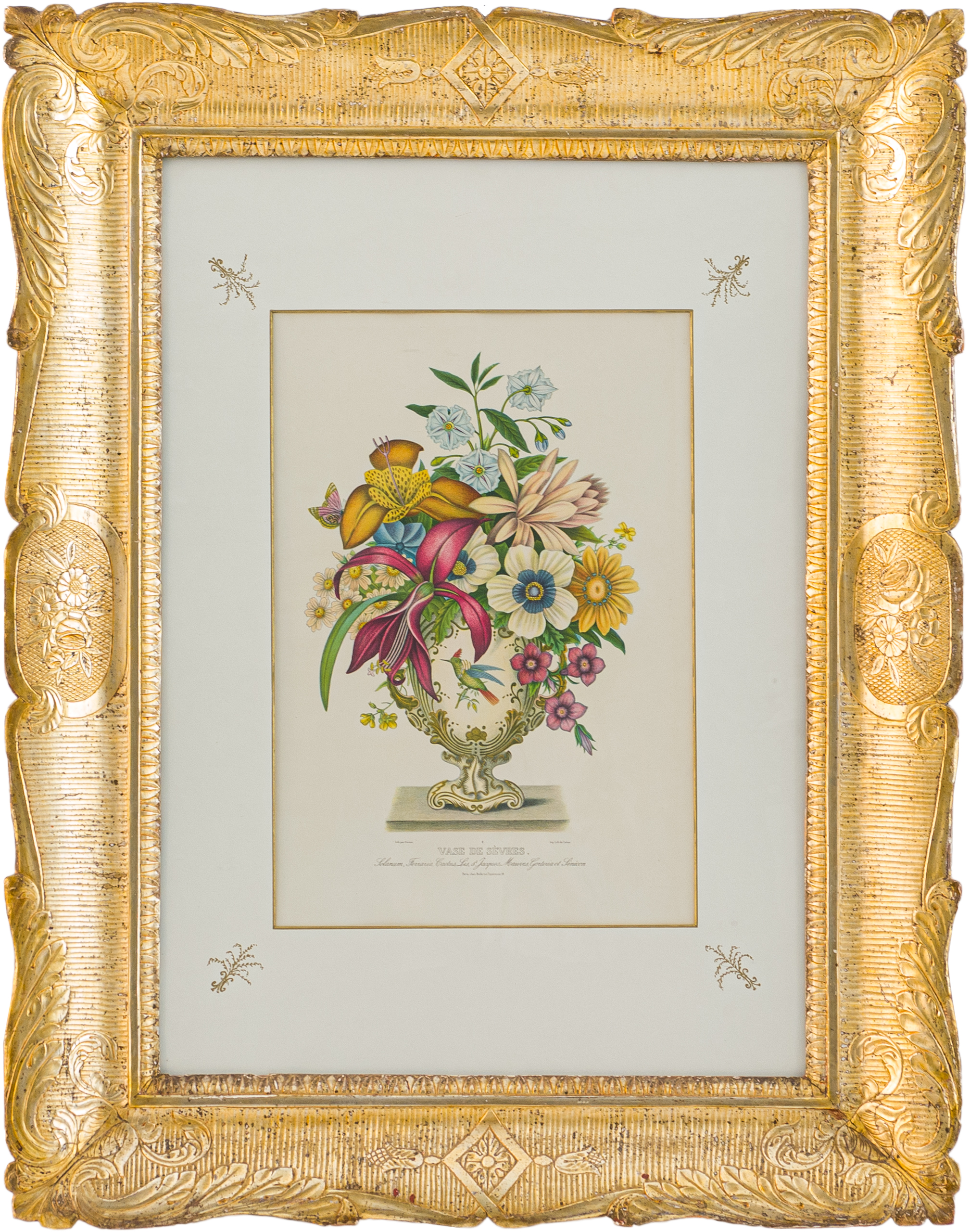 Cornice a vassoio in legno intagliato e dorato ad argento e mistura con all'interno incisione Francese del XIX secolo raffigurante "Vaso di Sevres con fiori"