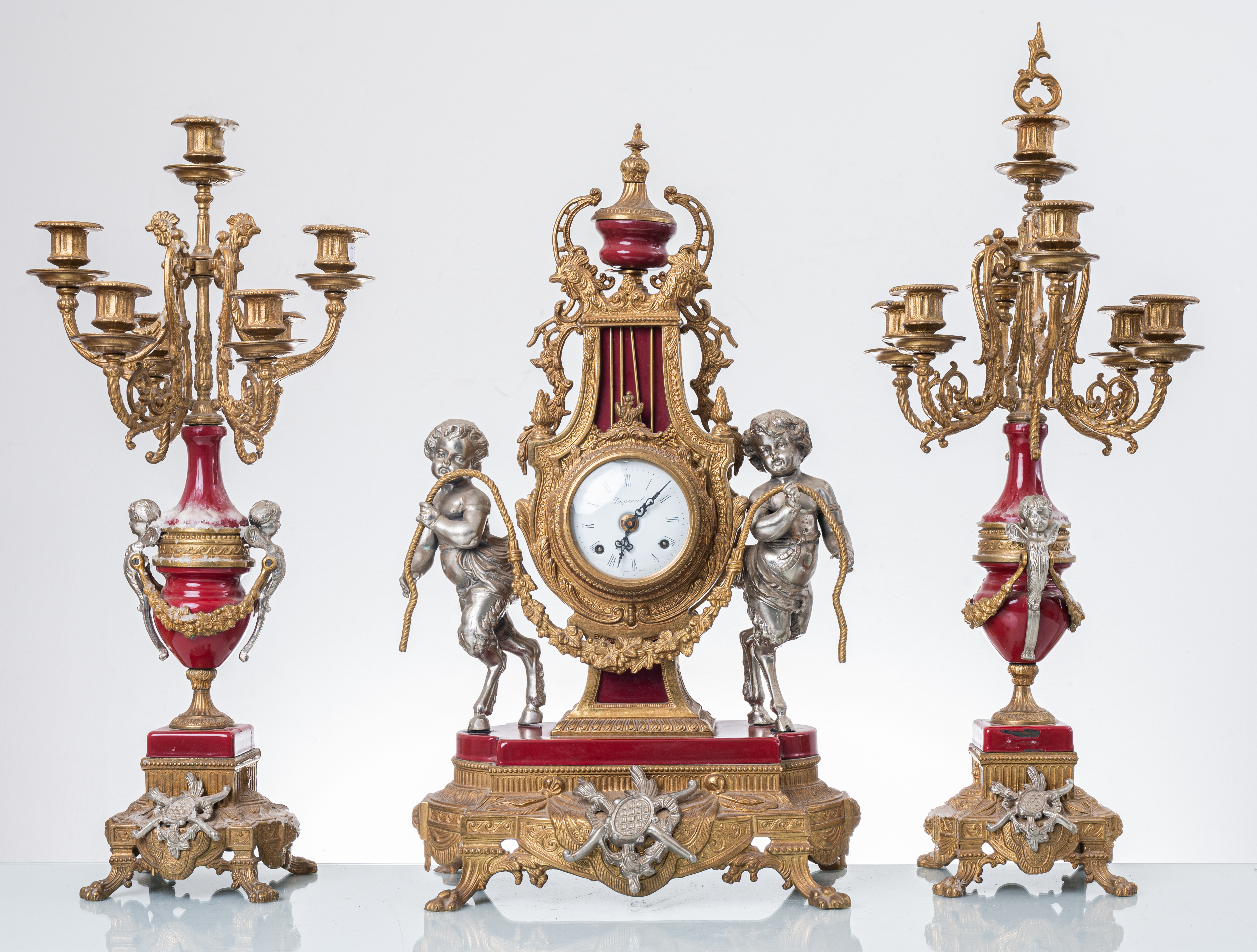 Trittico composto da orologio e due candelabri a sette fiamme in metallo smaltato.