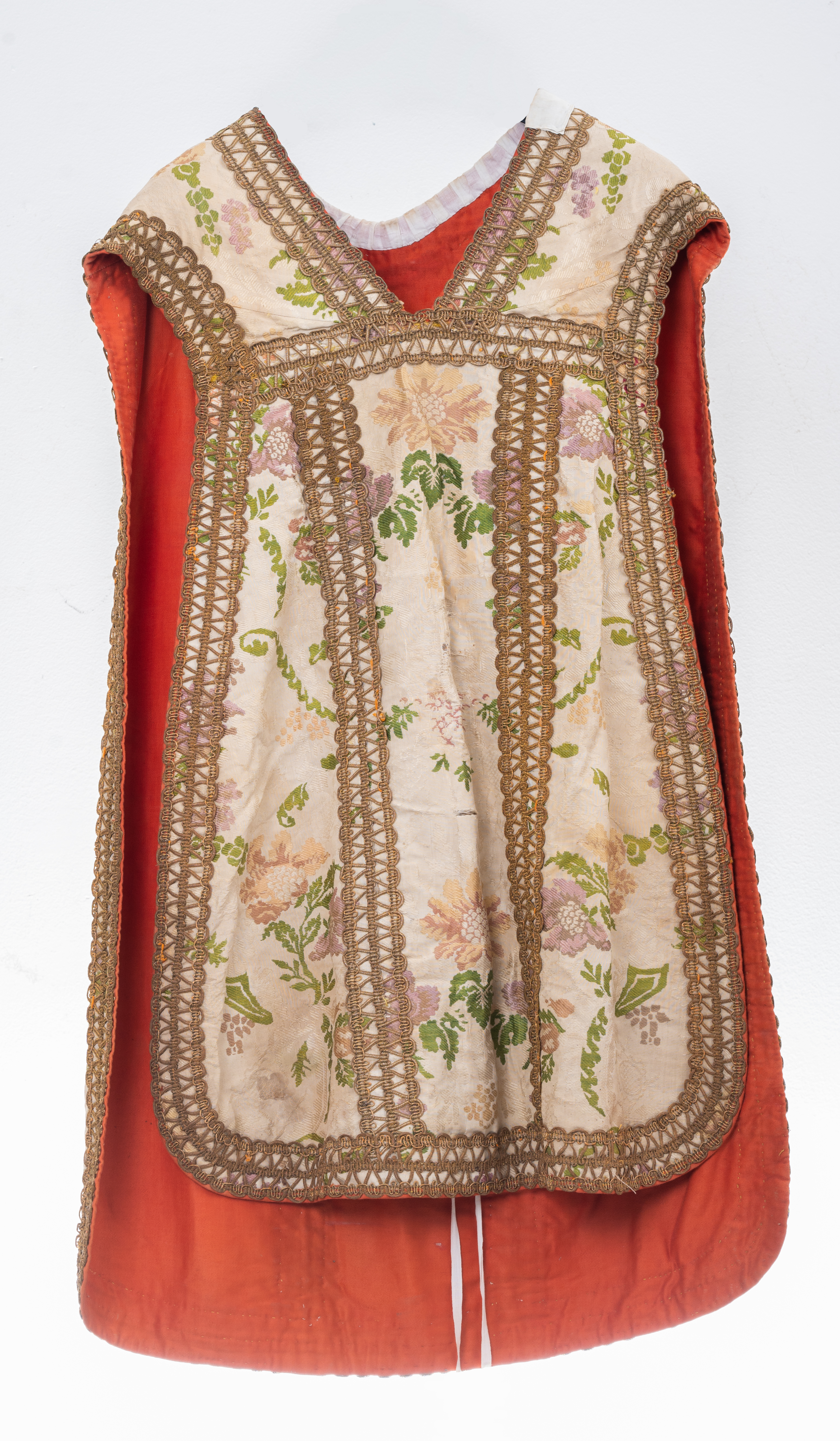 Pianeta in stoffa riccamente lavorata a mano con riquadrature a fili dorati.