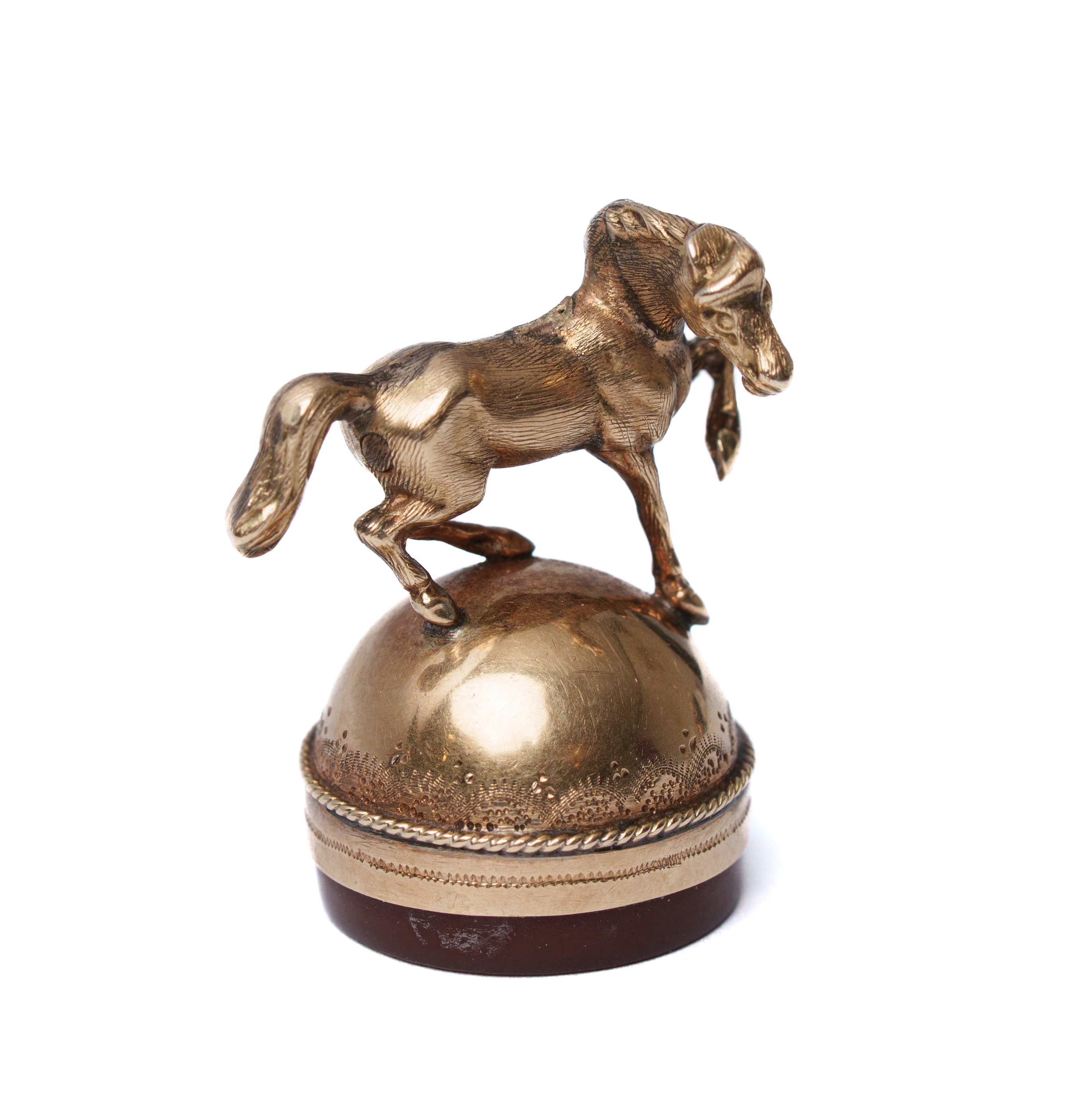 SIGILLO in oro giallo 18 KT, parte superiore a foggia di cavallo e corniola (g. 4,50).