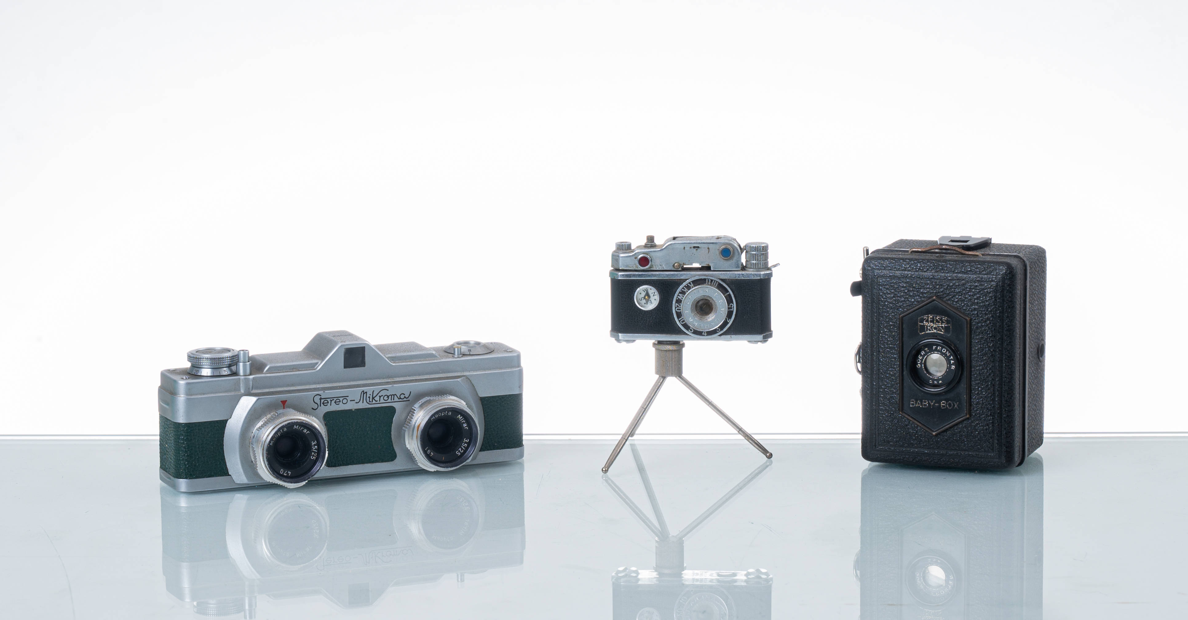 Accendino K.K.W. da tavolo con piede tripode; Meopta stereo Mikroma fotocamera; Zeiss Ikon "Baby box" fotocamera.