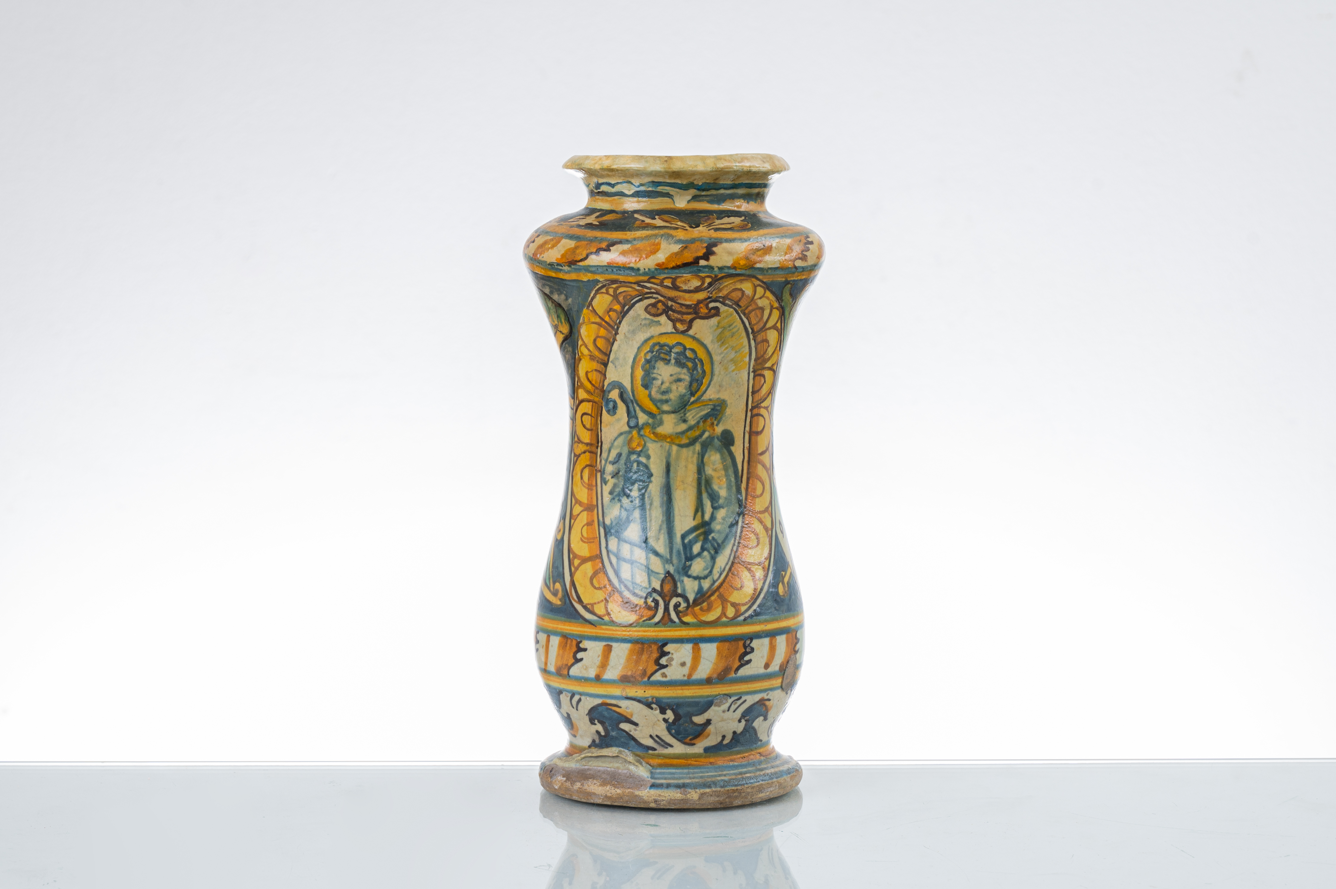 Albarello in ceramica decorata e dipinta policroma, medaglione centrale raffigurante "Santo" (restauri e usure).