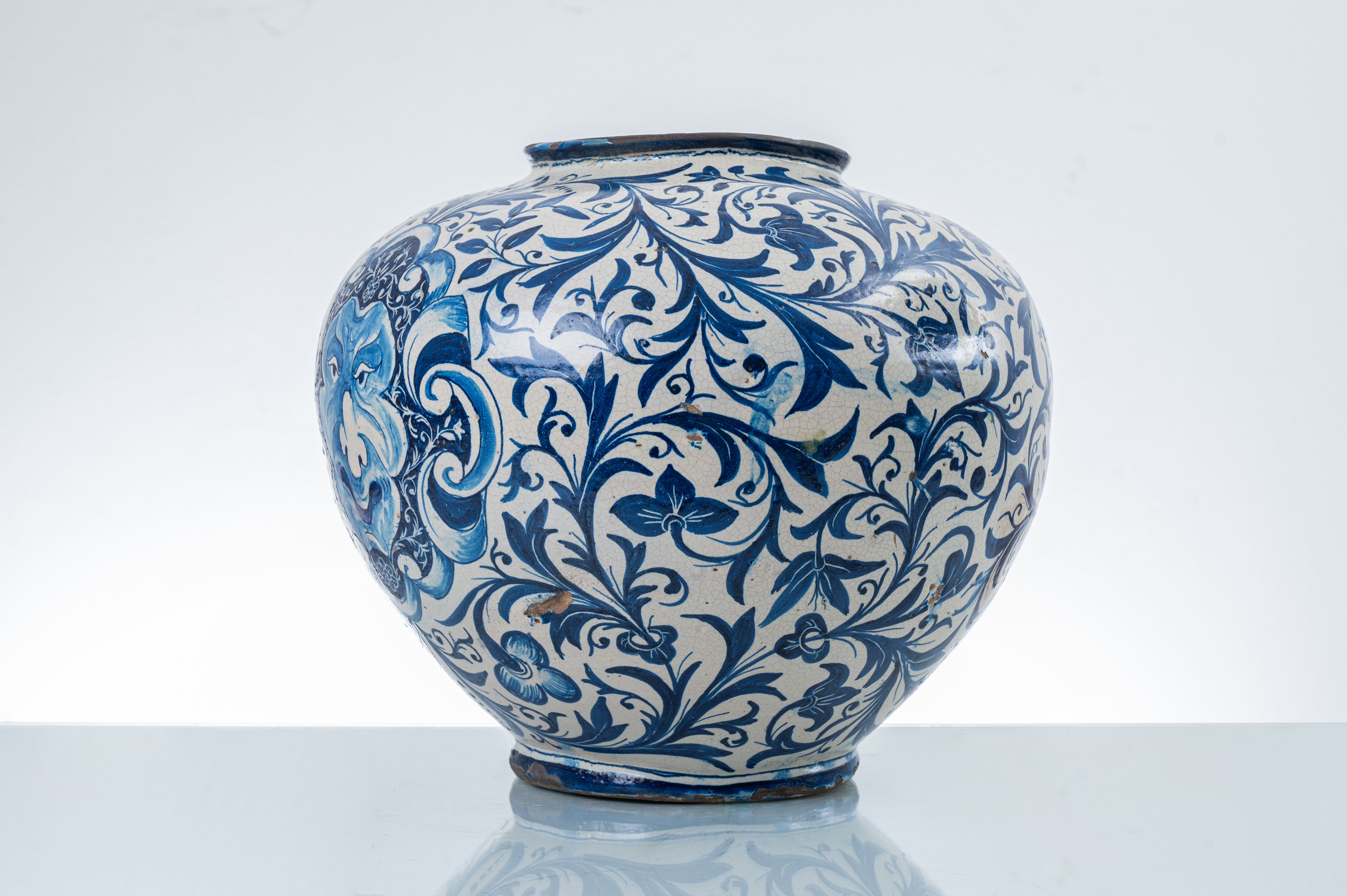 Grande boccia in ceramica decorata e dipinta a motivo floreale e fogliaceo nei toni del blu (usure e difetti).