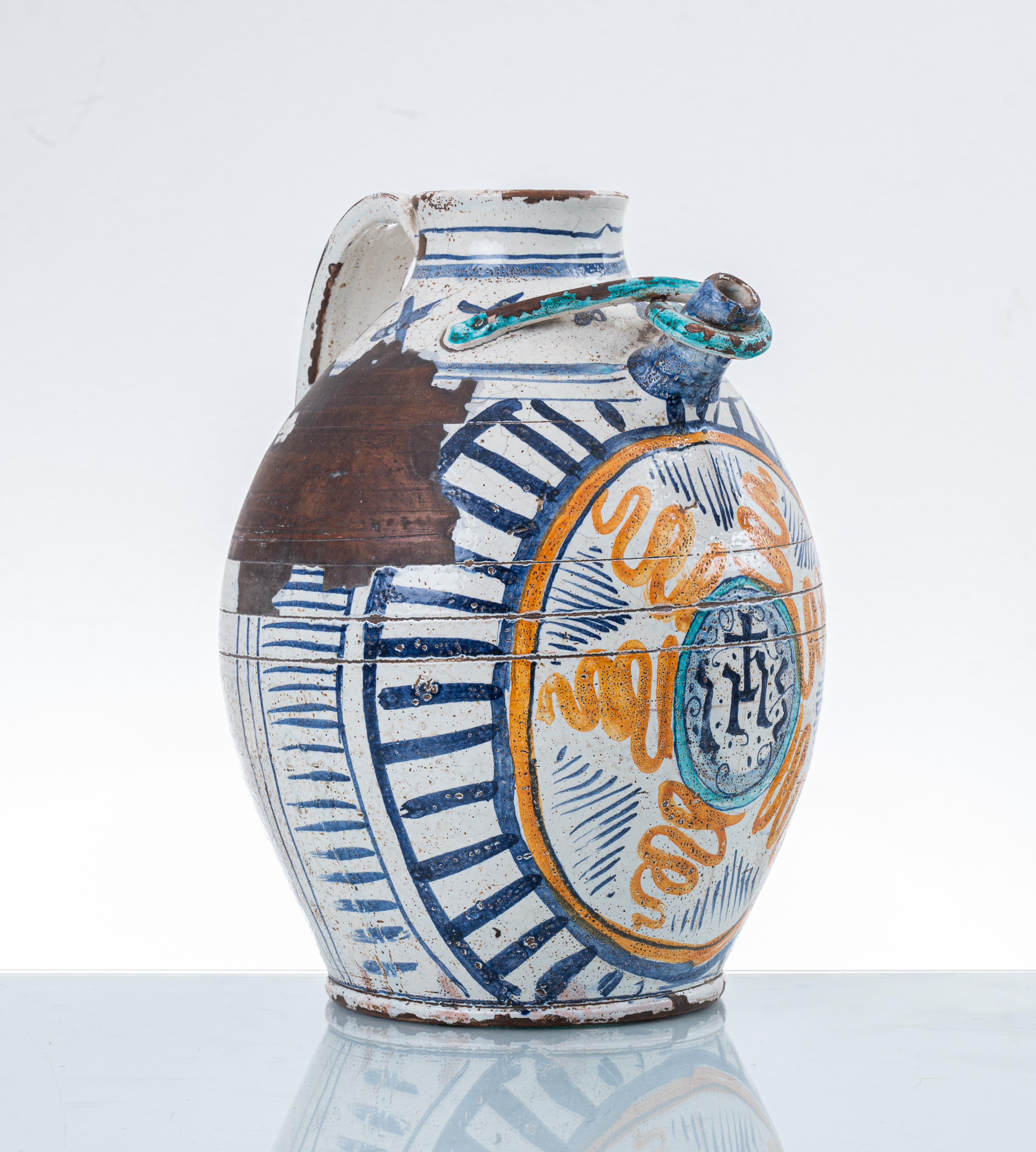 Orcio in ceramica decorata e dipinta con medaglione centrale (usure e mancanze).