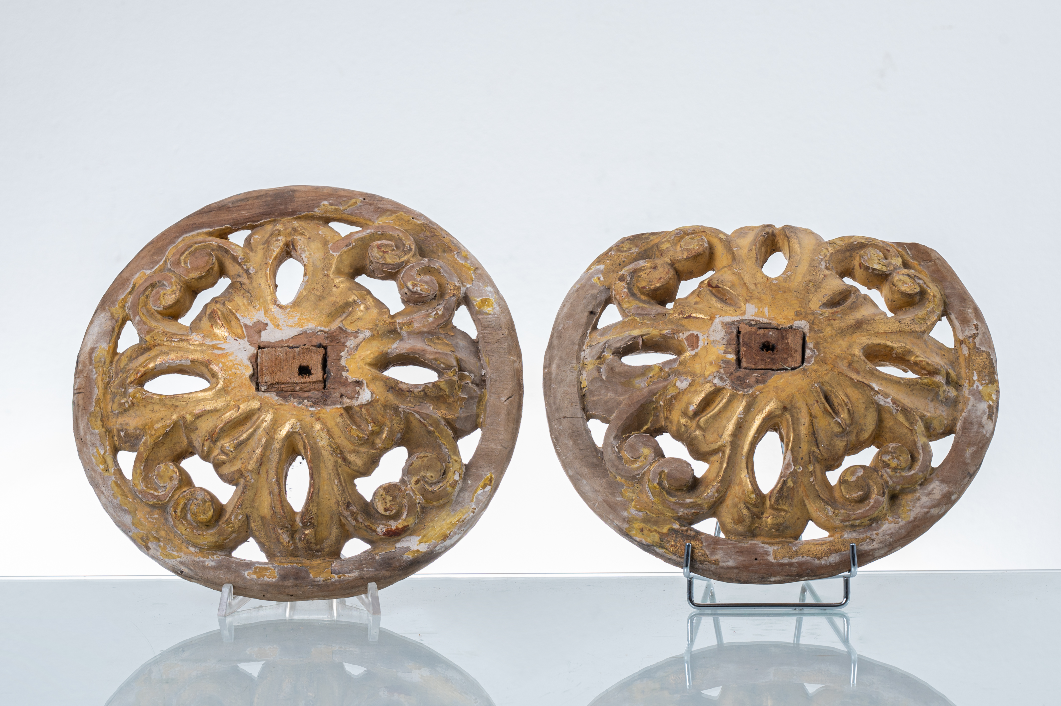 Coppia di fregi di forma rotonda in legno dorato ad oro zecchino (usure e mancanze).