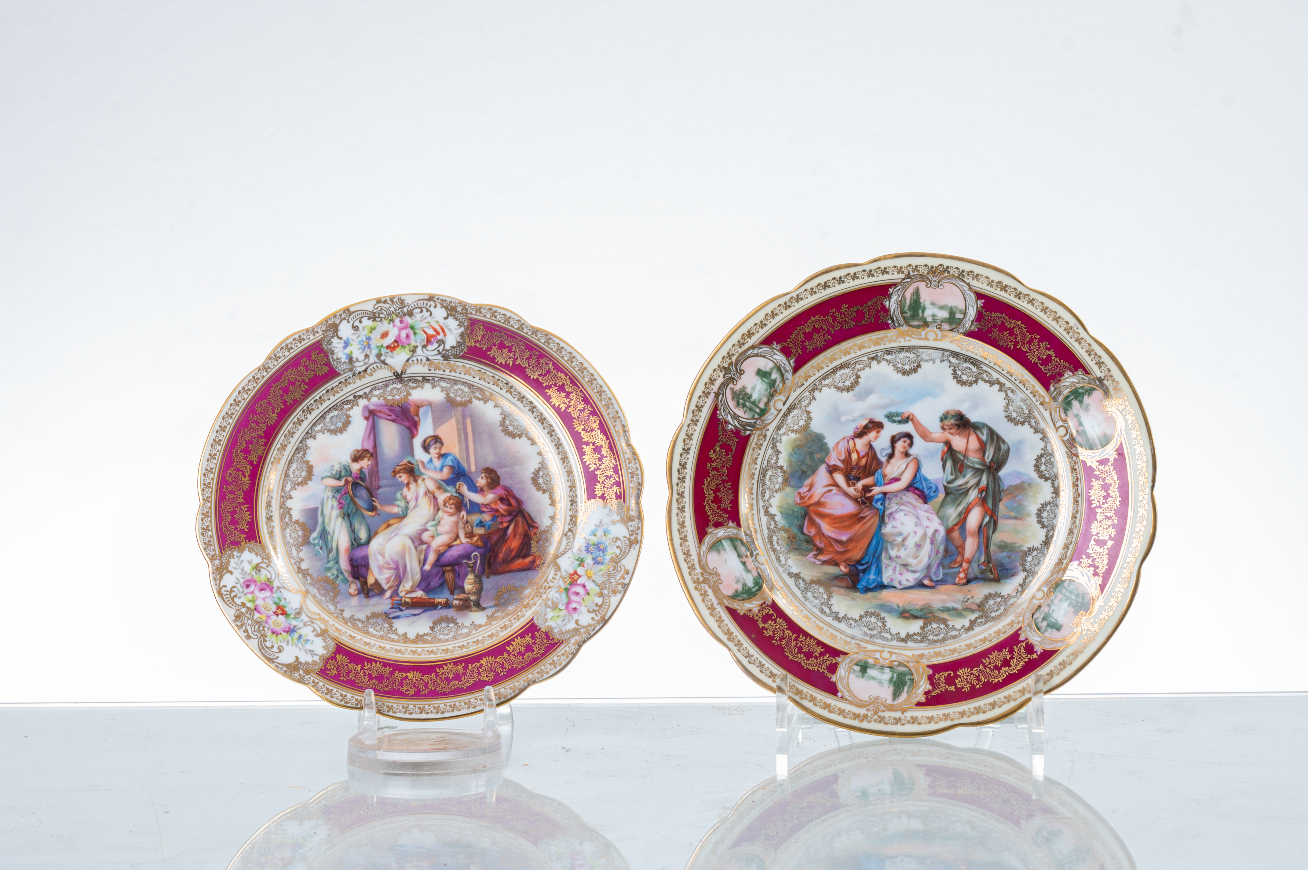 Due piatti in porcellana decorata e dipinta raffiguranti "Scena mitologica".
