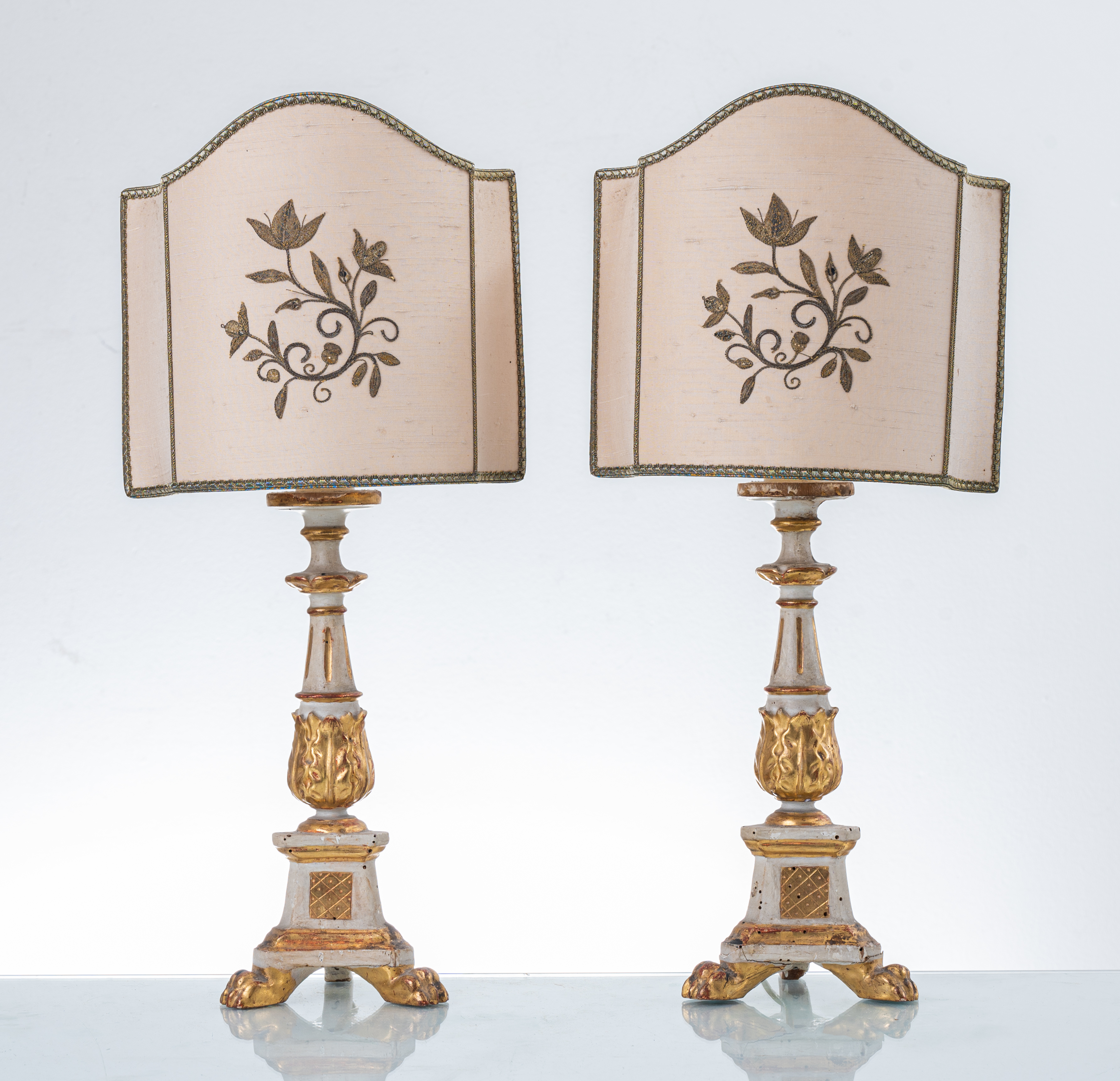 Coppia di candelieri in legno laccato e dorato con ventole in seta ricamata (elettrificati).