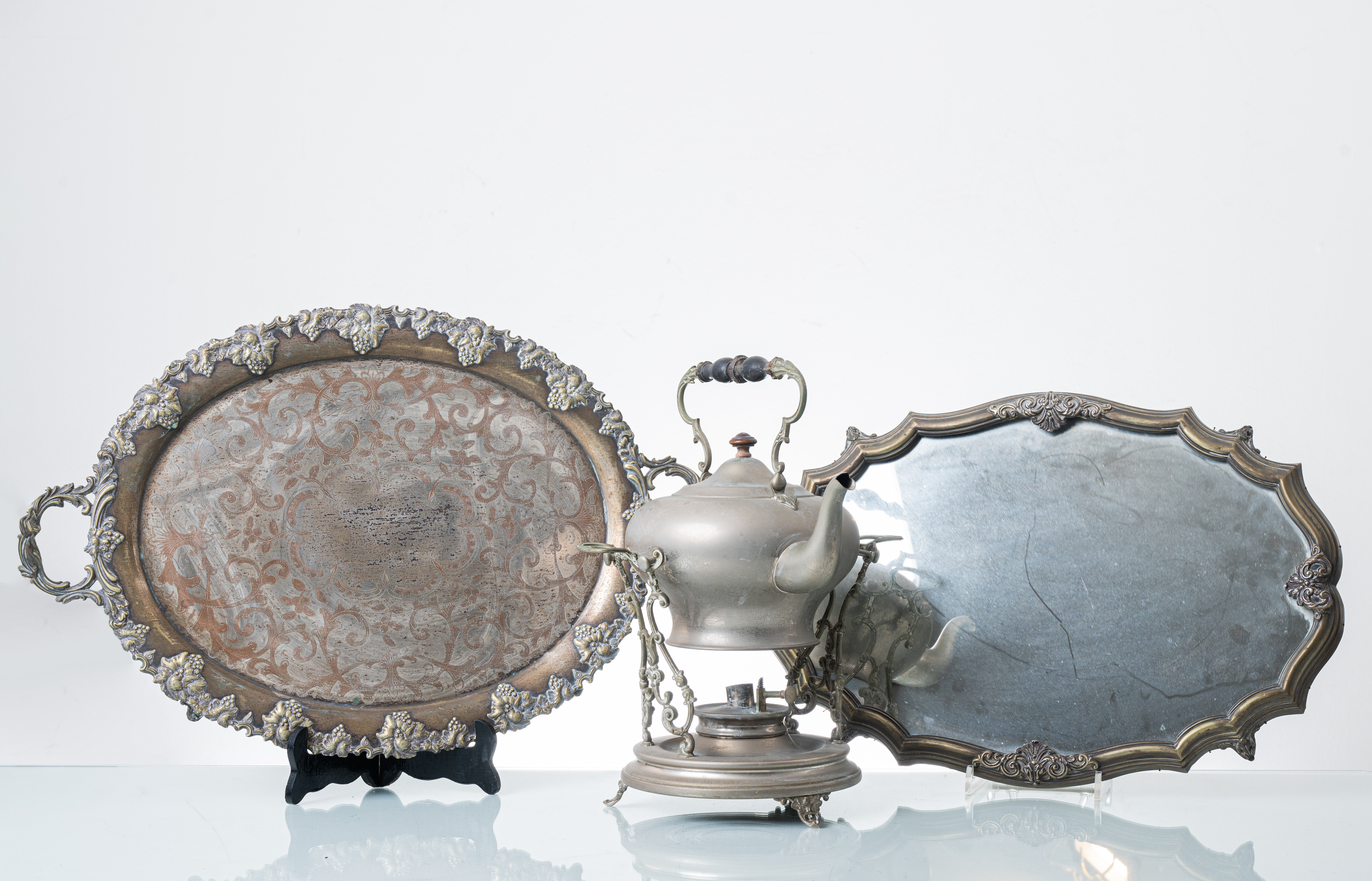 Vassoio con manici in metallo argentato riccamente cesellato, vassoio in metallo argentato con piano specchiato e samovar in peltro (usure).