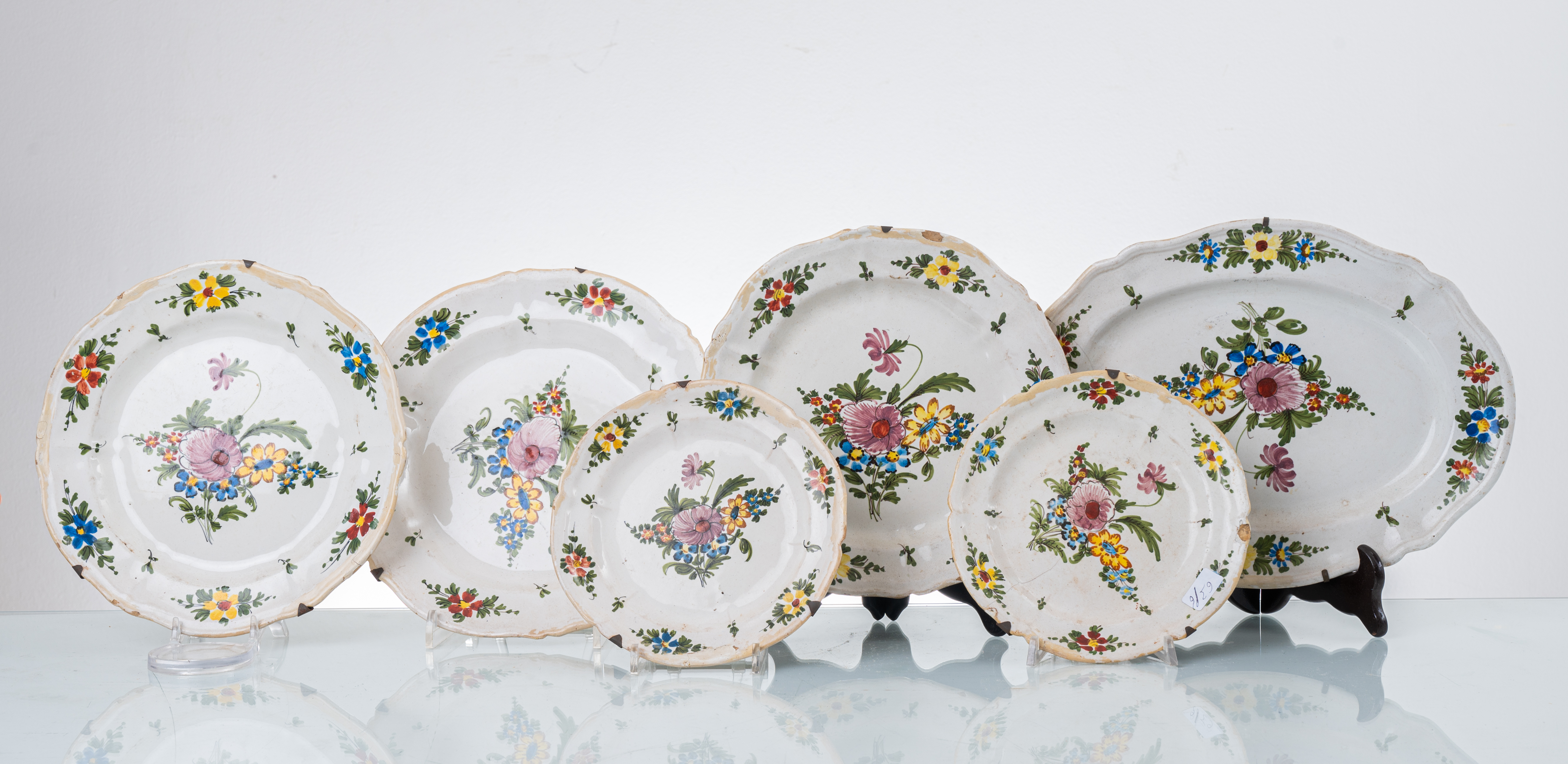 Tre piatti rotondi, due piattini e piatto ovale in ceramica decorata e dipinta a motivi floreali (usure).