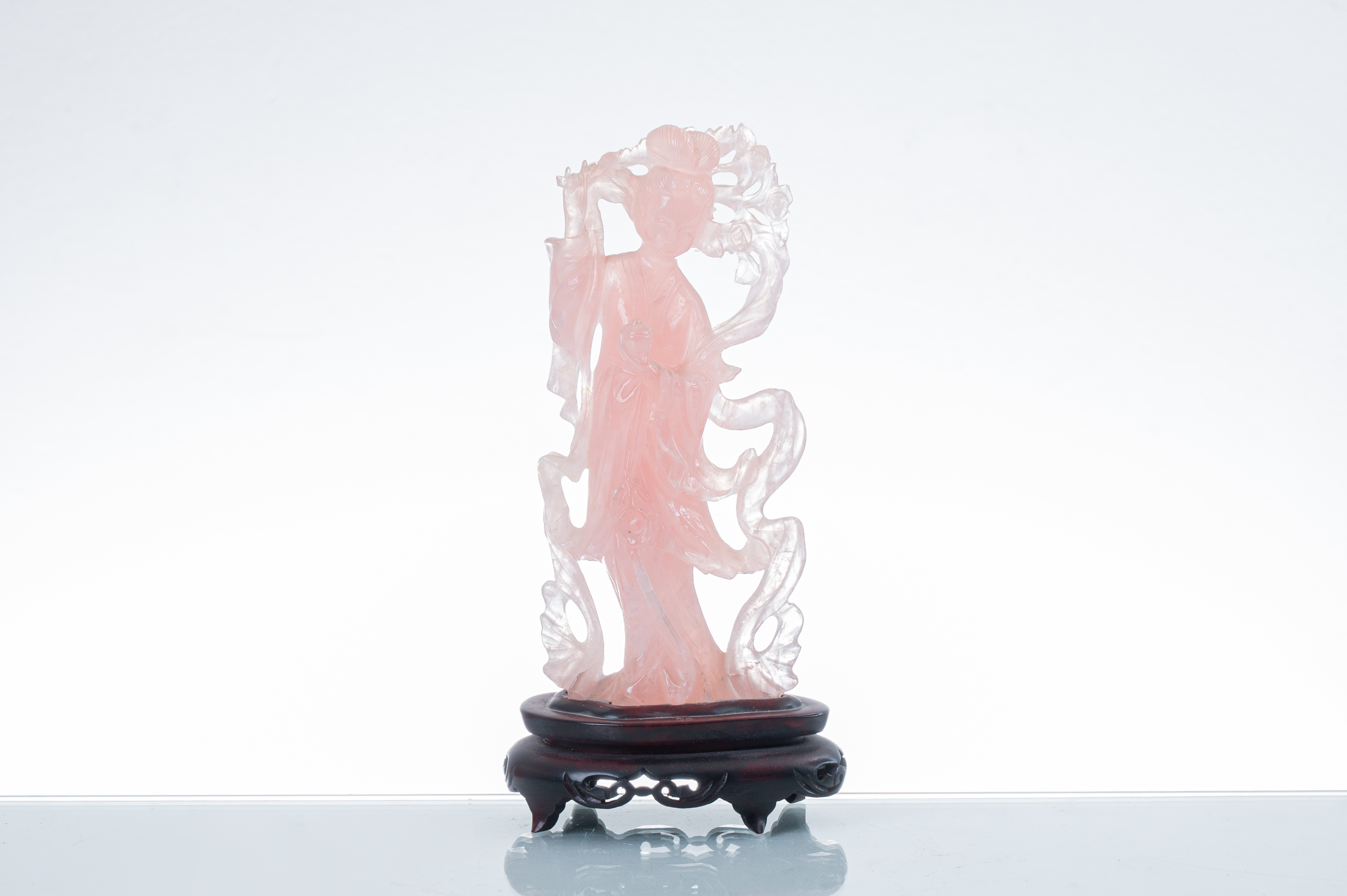 Scultura in quarzo rosa raffigurante "Geisha", base in legno ebanizzato (usure).
