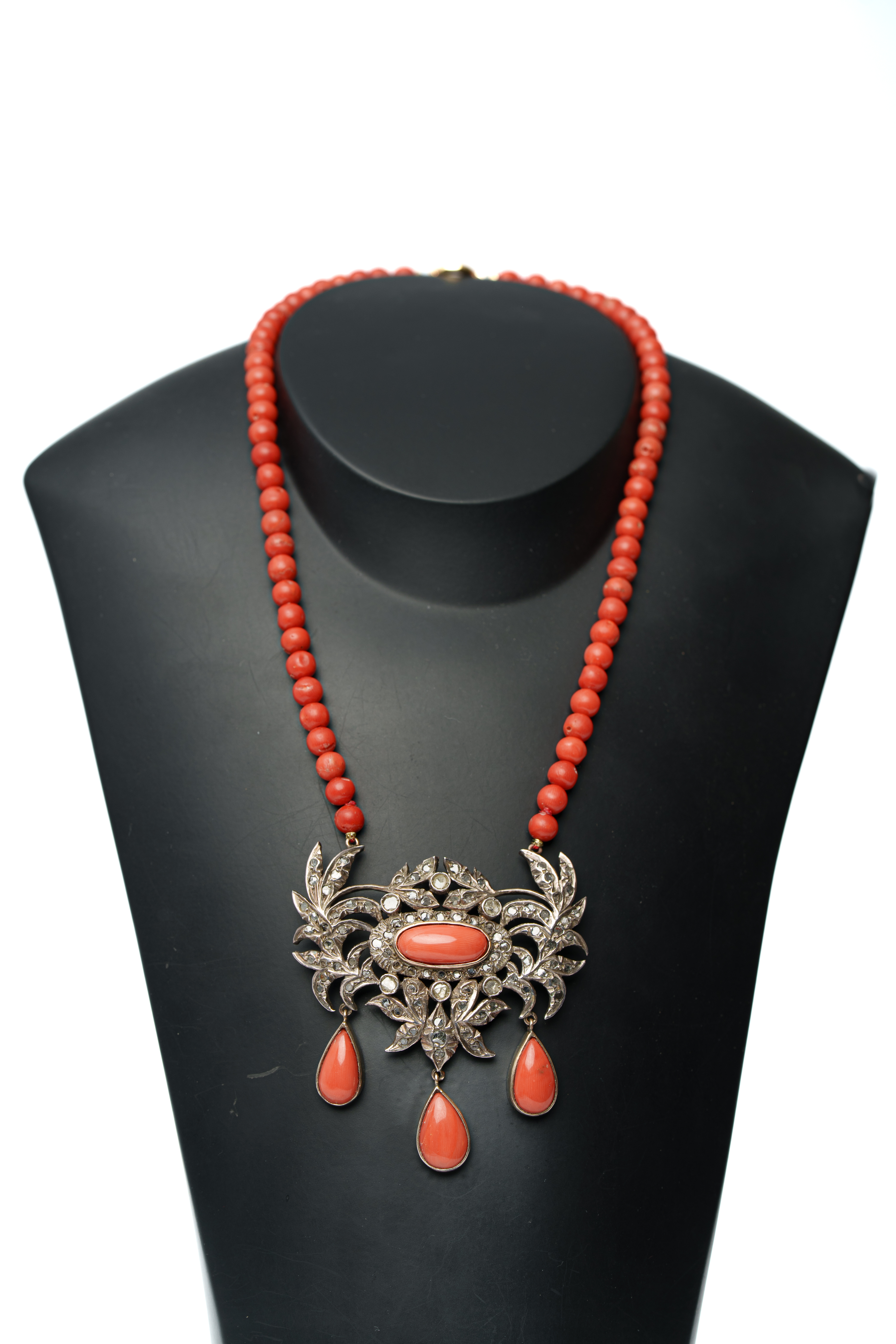 COLLANA in corallo con pendente in oro giallo 9 KT e argento con diamanti tre facce ct. 1.00 peso di stima, susta in oro giallo 18 KT (g. 42.70).