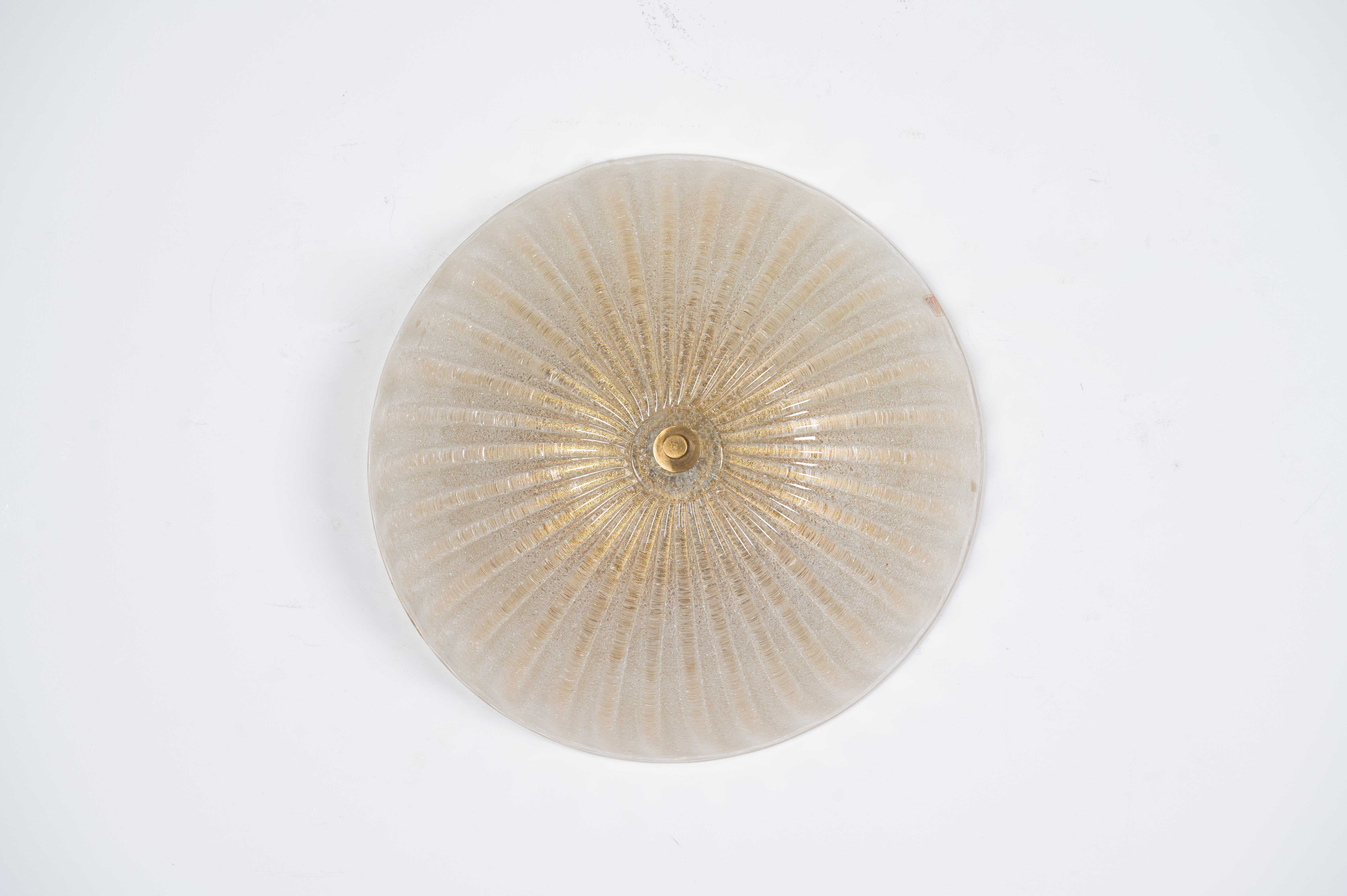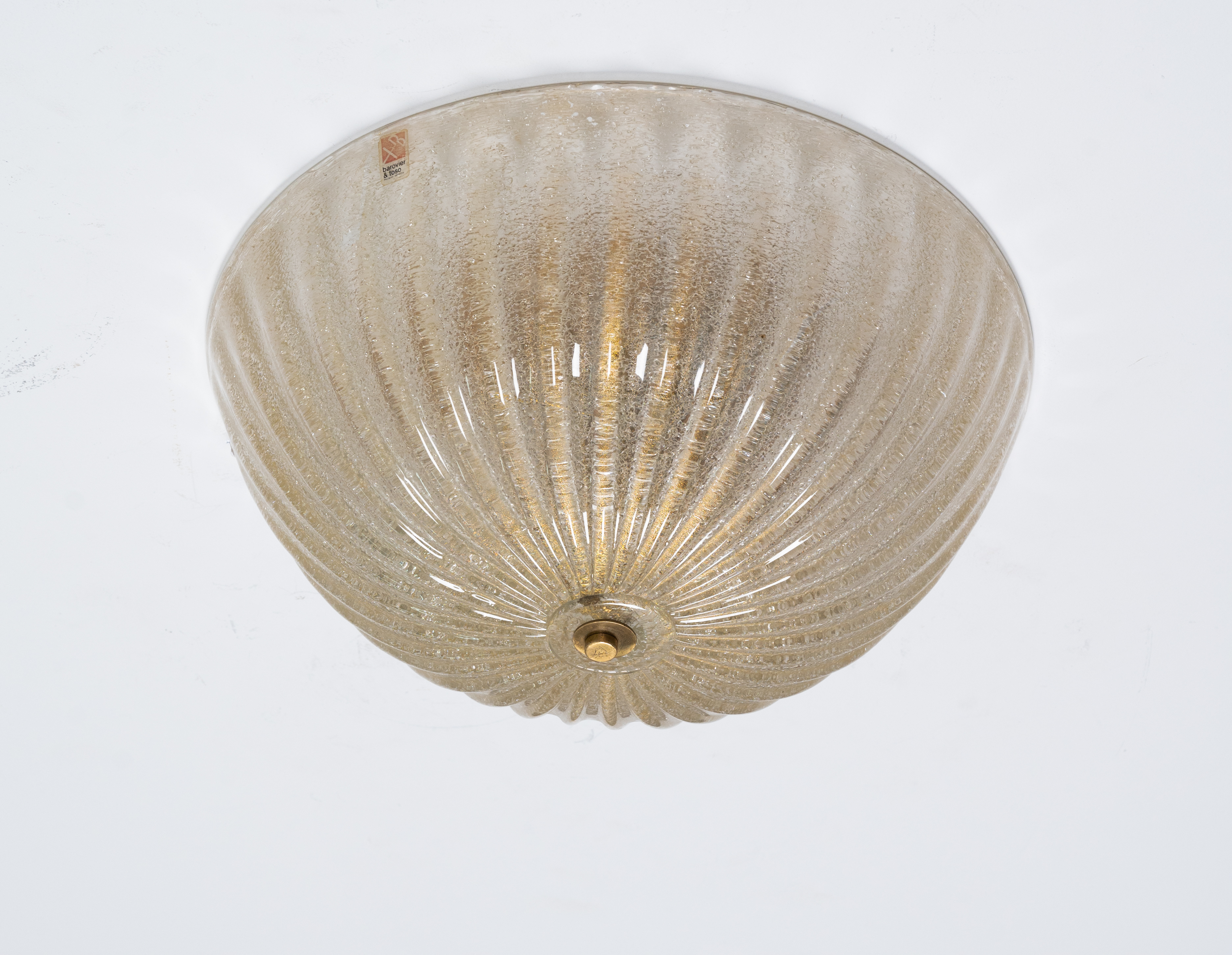 Lampada da soffitto a due luce con struttura in metallo, diffusore semi globulare in vetro incolore con inclusioni oro e decorato con costolature concentriche, minuterie in ottone. Etichetta di produzione.