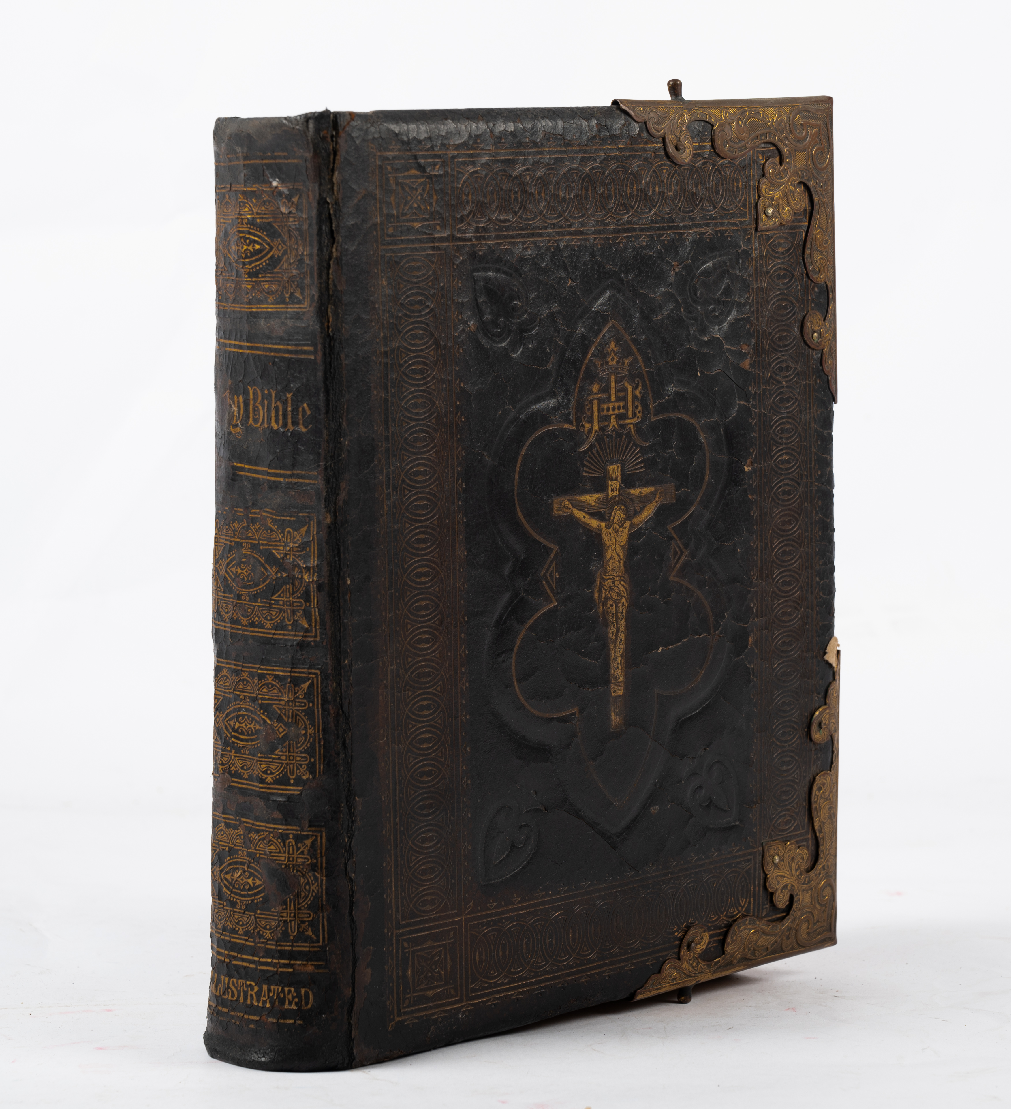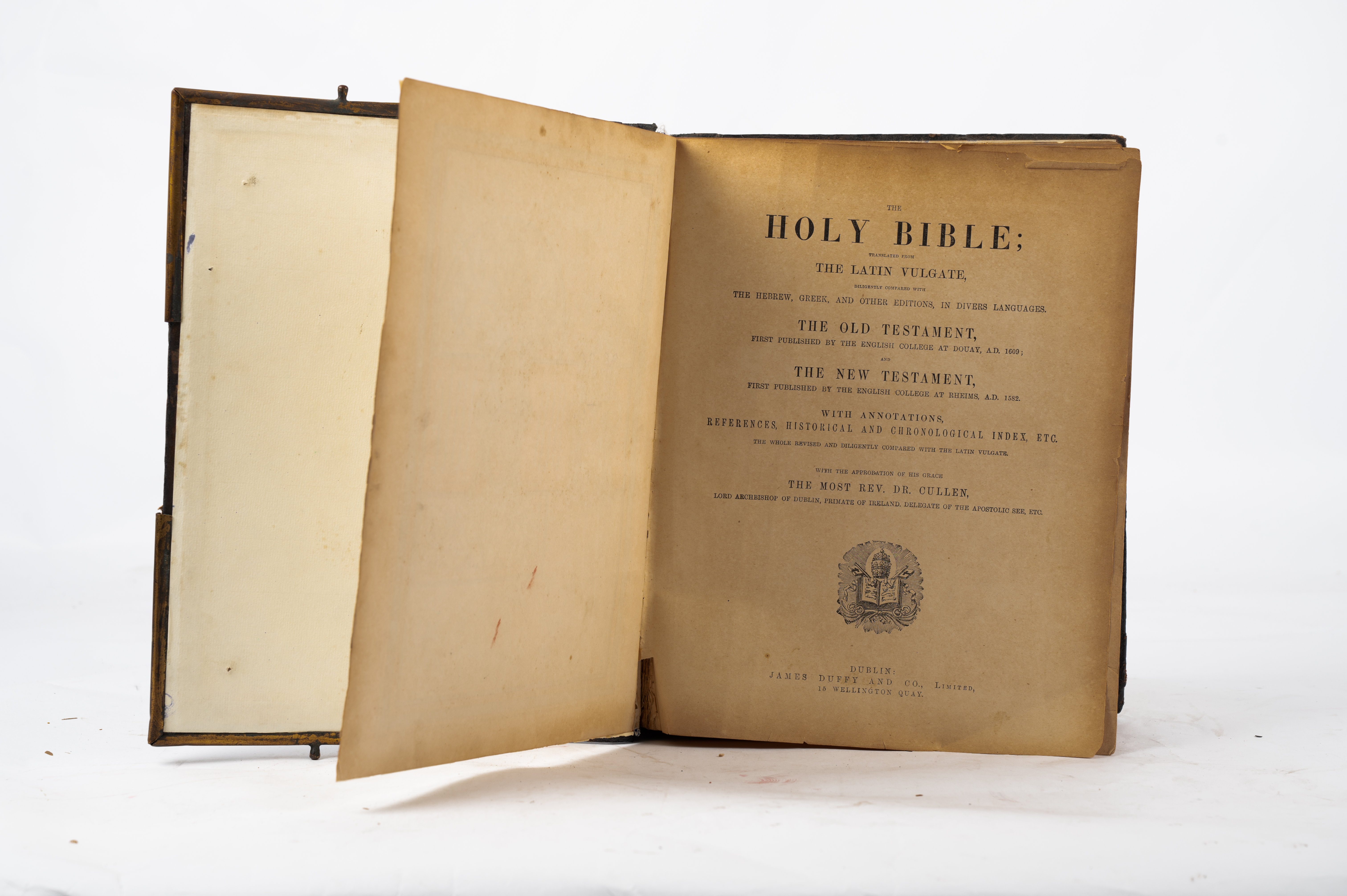 Paul Cullen THE HOLY BIBLE TRANSLATED FROM THE LATIN VULGATE, DILIGENTLY COMPARED WITH THE HEBREW, GREEK, AND OTHER EDITIONS IN DIVERS LANGUAGES. THE OLD TESTAMENT, FIRST PUBLISHED BY THE ENGLISH COLLEGE AT DOUAY, A. D. 1609 AND THE NEW TESTAMENT FIRST PUBLISHED BY THE ENGLISH COLLEGE AT RHEIMS, A. D. 1582. WITH ANNOTATIONS, REFERENCES, HISTORICAL AND CHRONOLOGICAL INDEX, ETC….. ed. James Duffy & Co, Dublin, 1865. Legatura editoriale in pelle nera finemente lavorata e dorata ai piatti e al dorso. Tagli dorati. Cantonali in bronzo di raffinata lavorazione ma fermagli assenti. Registro di famiglia finemente decorato. Incisione al frontespizio del Nuovo Testamento. Illustrato con tavole a piena pagina a colori e in b/n f. t. e molte illustrazioni in b/n nel testo. Pp. 764, 219, (4).