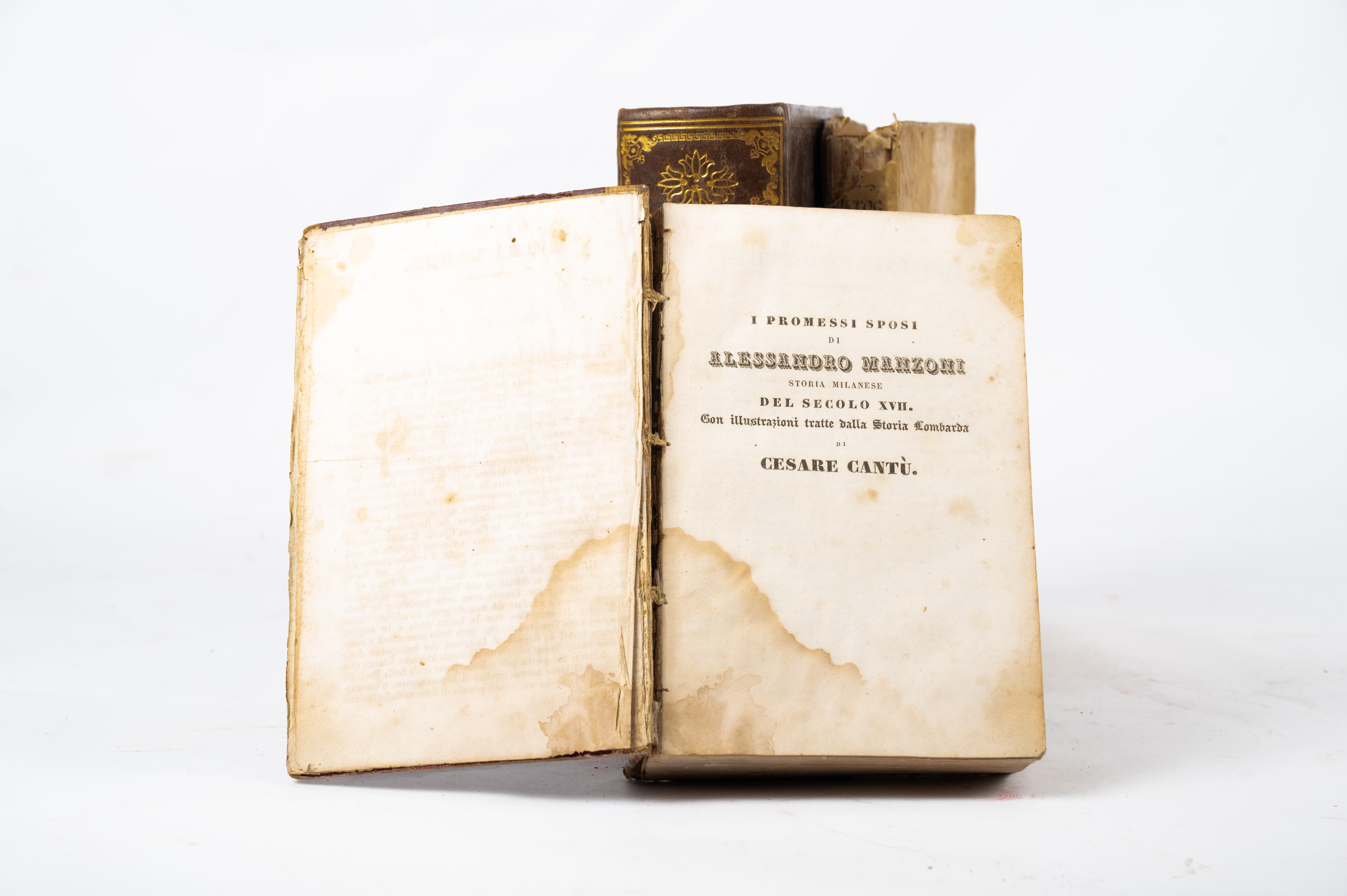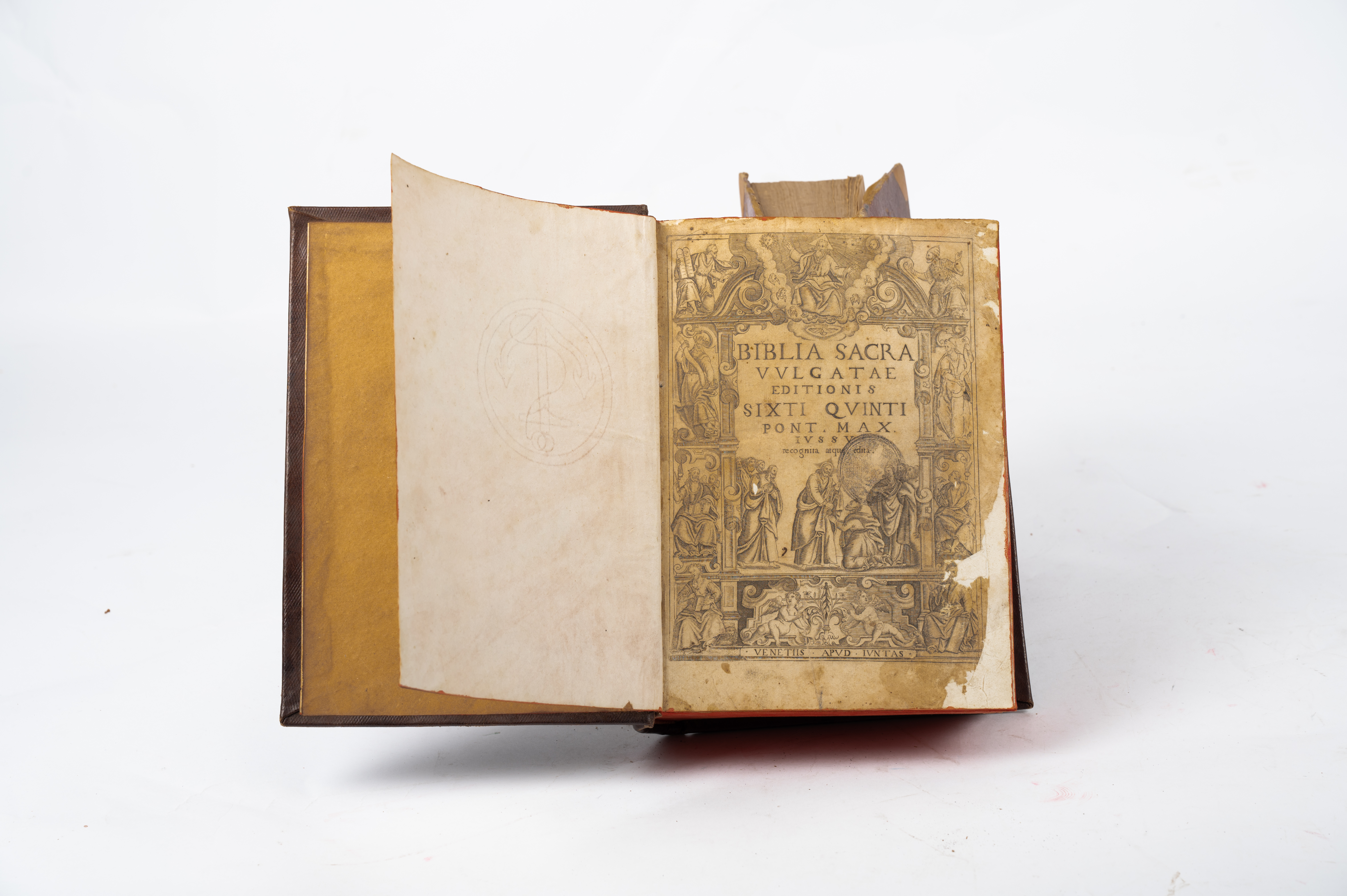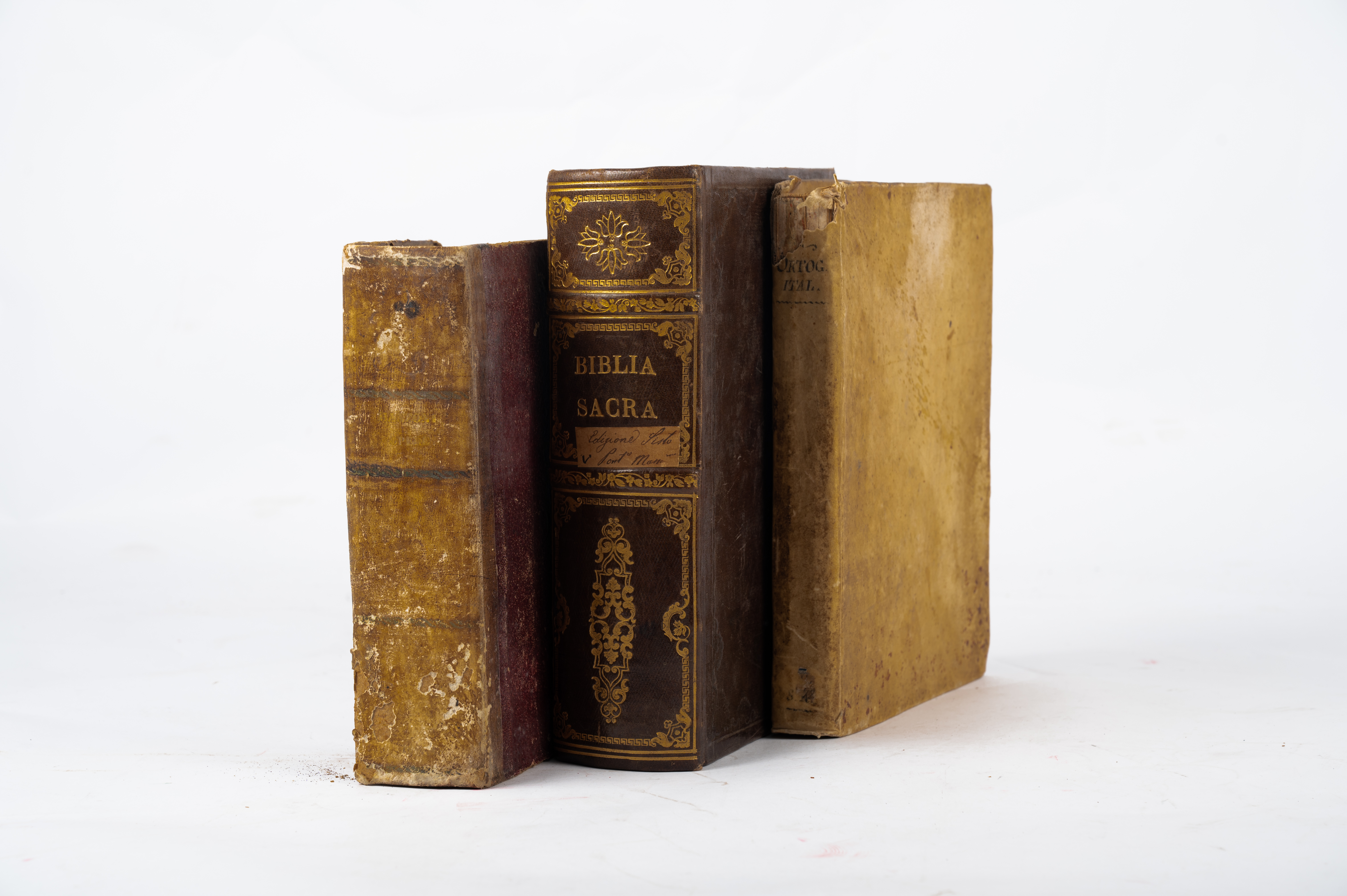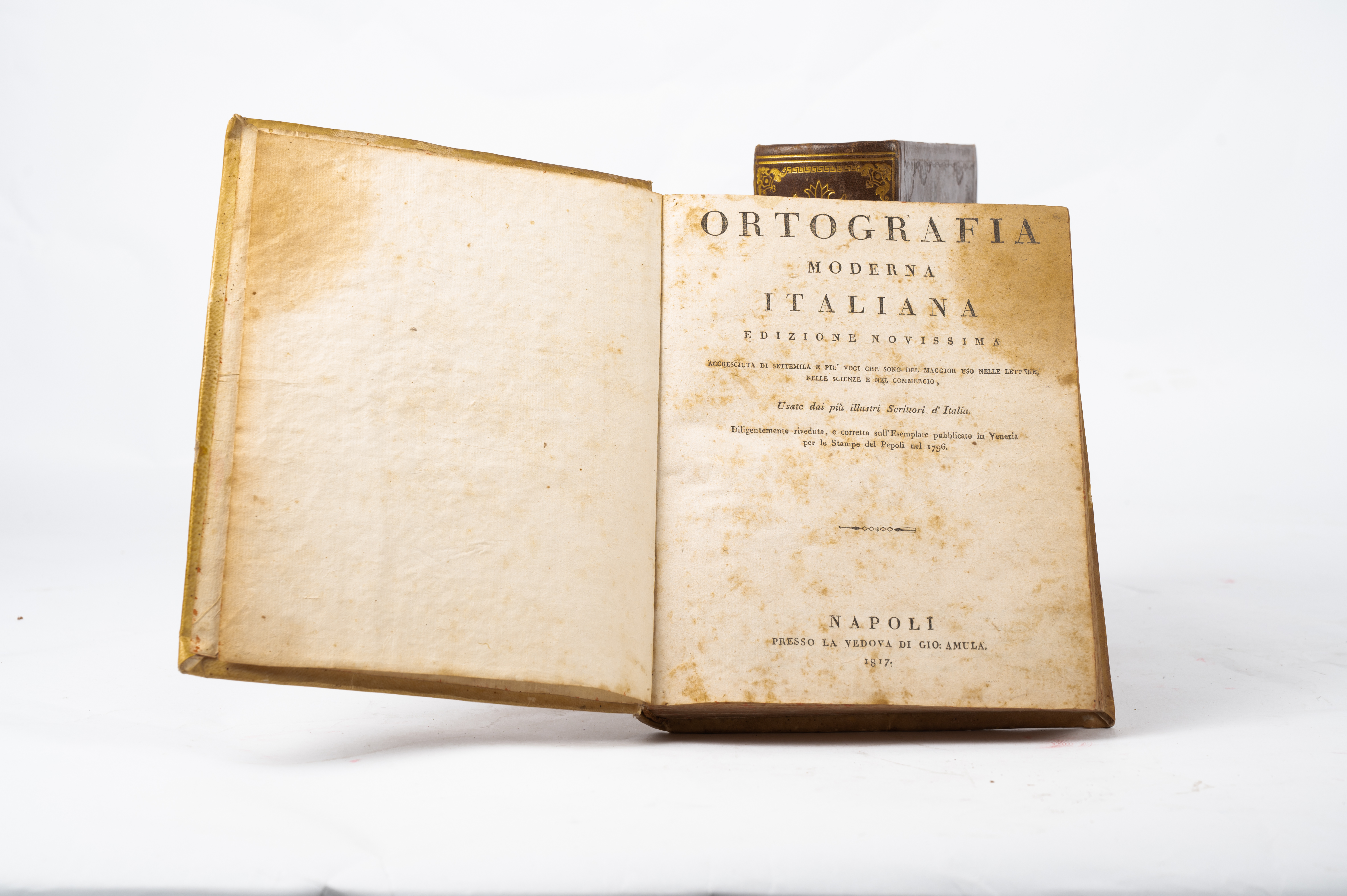 TRE VOLUMI DI VARIA DEL XVII E XIX SECOLO: 1) BIBLIA SACRA VULGATAE EDITIONIS SIXTI QUINTI PONT. MAX. IUSSU RECOGNITA ATQUE EDITA, Venetiis apud Iuntas MDCVII. In 4°. Bella legatura ottocentesca in piena pelle con due nervature al dorso e titoli, fregi, filetti e decori impressi in oro al dorso. Piatti con cornice a decorata a secco. Tagli colorati. Opera restaurata ed in ottime condizioni, il volume presenta un ricchissimo apparato di incisioni xilografiche con scene sacre. Circa 1200 pagine. 2) OPERE DI ALESSANDRO MANZONI IN VERSO E IN POESIA, volume unico, ed. Napoli, Gabinetto Letterario 1844. Macchie e fioritura con qualche pagina parzialmente slegata. Legatura coeva in mezza pergamena con piatti cartonati. In buone condizioni. pp. 846. 3) Jacopo Facciolati ORTOGRAFIA MODERNA ITALIANA. EDIZIONE NOVISSIMA ACCRESCIUTA DI SETTEMILA E PIU’ VOCI, CHE SONO NEL MAGGIOR USO NELLE LETTERE. USATO DAI PIÙ ILLUSTRI SCRITTORI D'ITALIA. DILIGENTEMENTE RIVEDUTA E CORRETTA SULL'ESEMPLARE DI VENEZIA PER LE STAMPE DEL PEPOLI NEL 1796, ed. Napoli, Presso la Vedova di Gio. Amula 1817. In 8° grande. Note m. s. al contropiatto posteriore. Legatura coeva in piena pergamena con titoli m. s. al dorso. Tagli leggermente rifilati. Leggera mancanza del dorso alla cuffia superiore. Stampato su quatto colonne. Alcune pagine con bruniture del tempo. Jacopo Facciolati, (noto anche come Giacomo Fasolato, e latinizzato in Iacobus Facciolatus (1682- 1769), fu poeta, scrittore e latinista italiano cittadino, della Repubblica di Venezia.