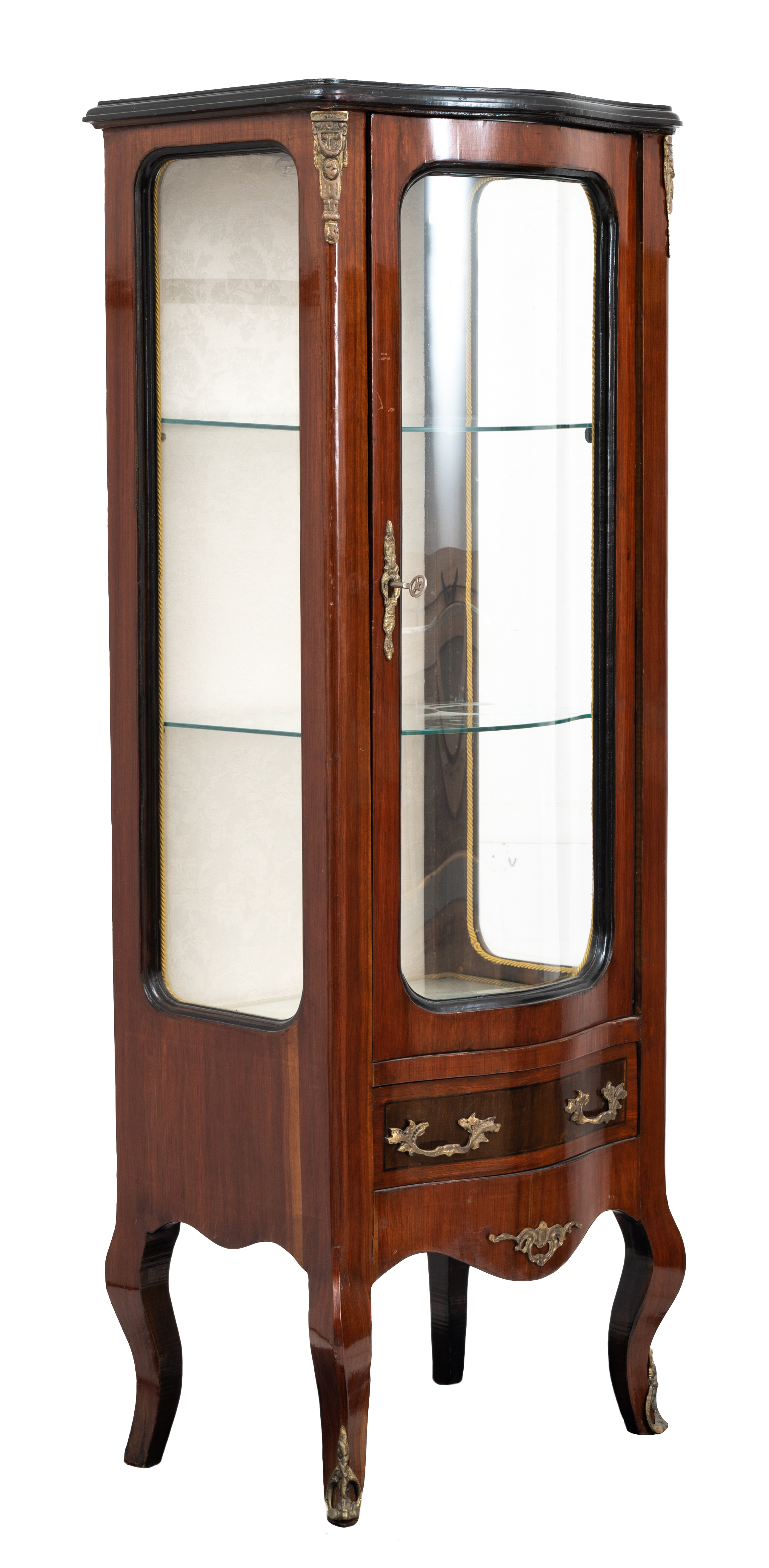 Piccola vetrina ad un'anta in legno di noce con applicazioni in bronzo, ripiani in vetro.