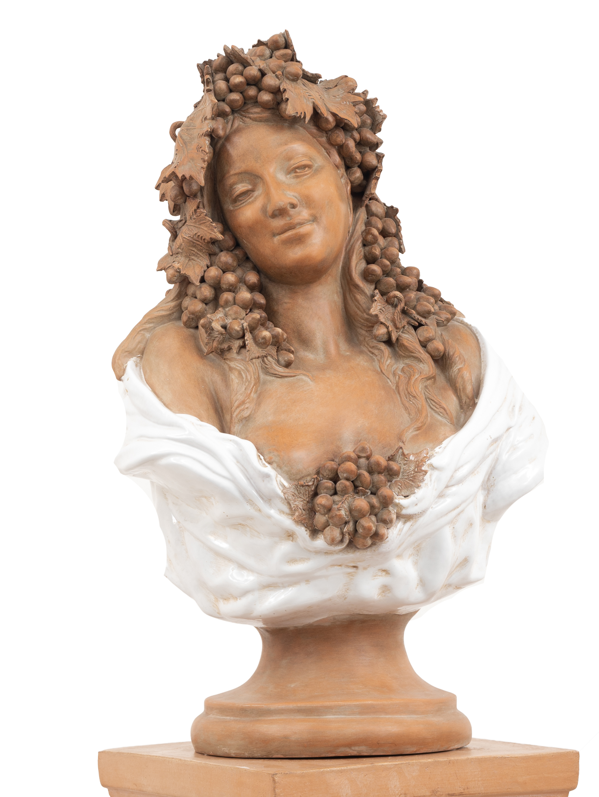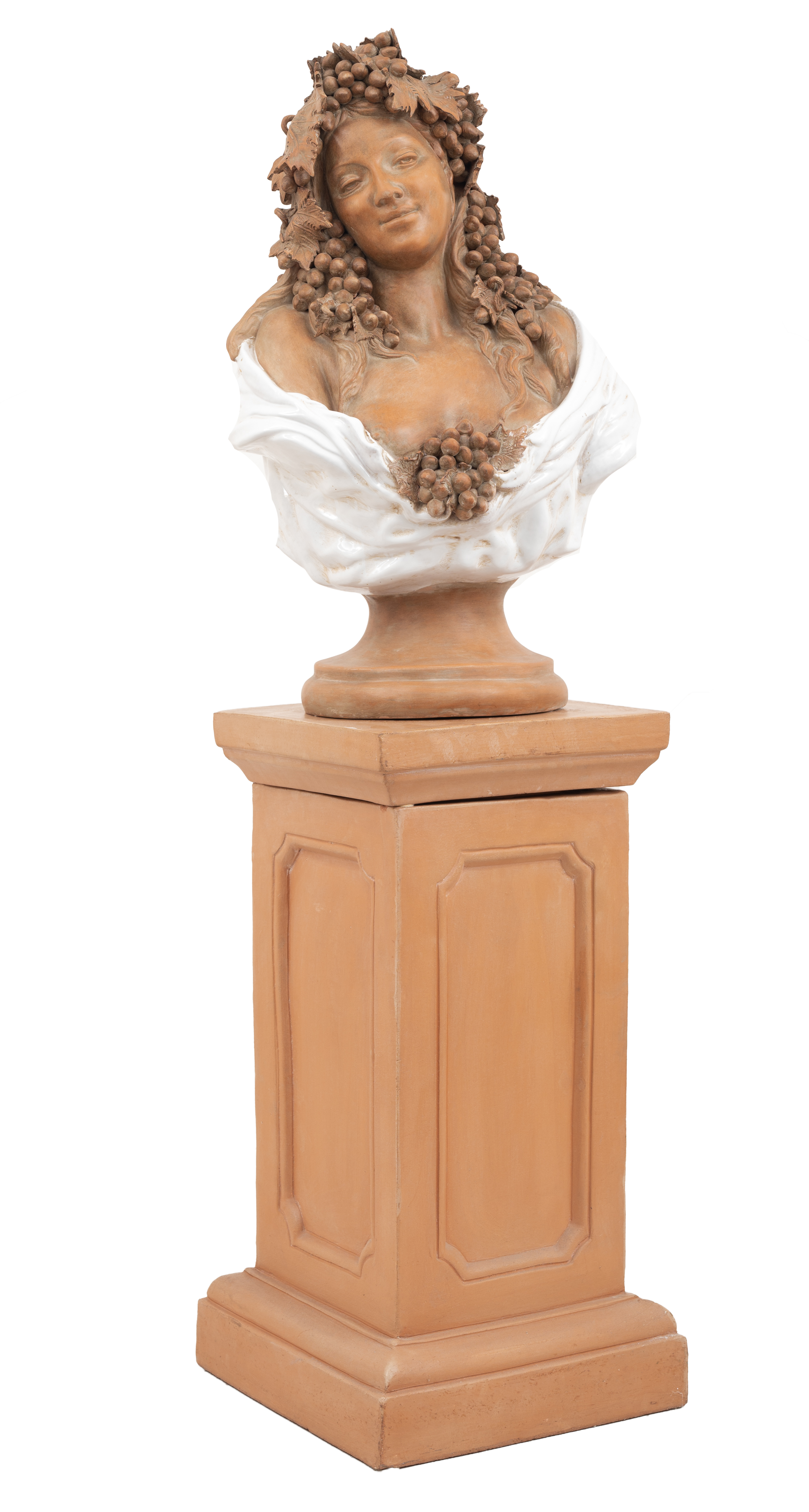 Scultura in terracotta con colonna raffigurante "L'allegoria dell'autunno", firma nel retro Martoni Paolo (usure).