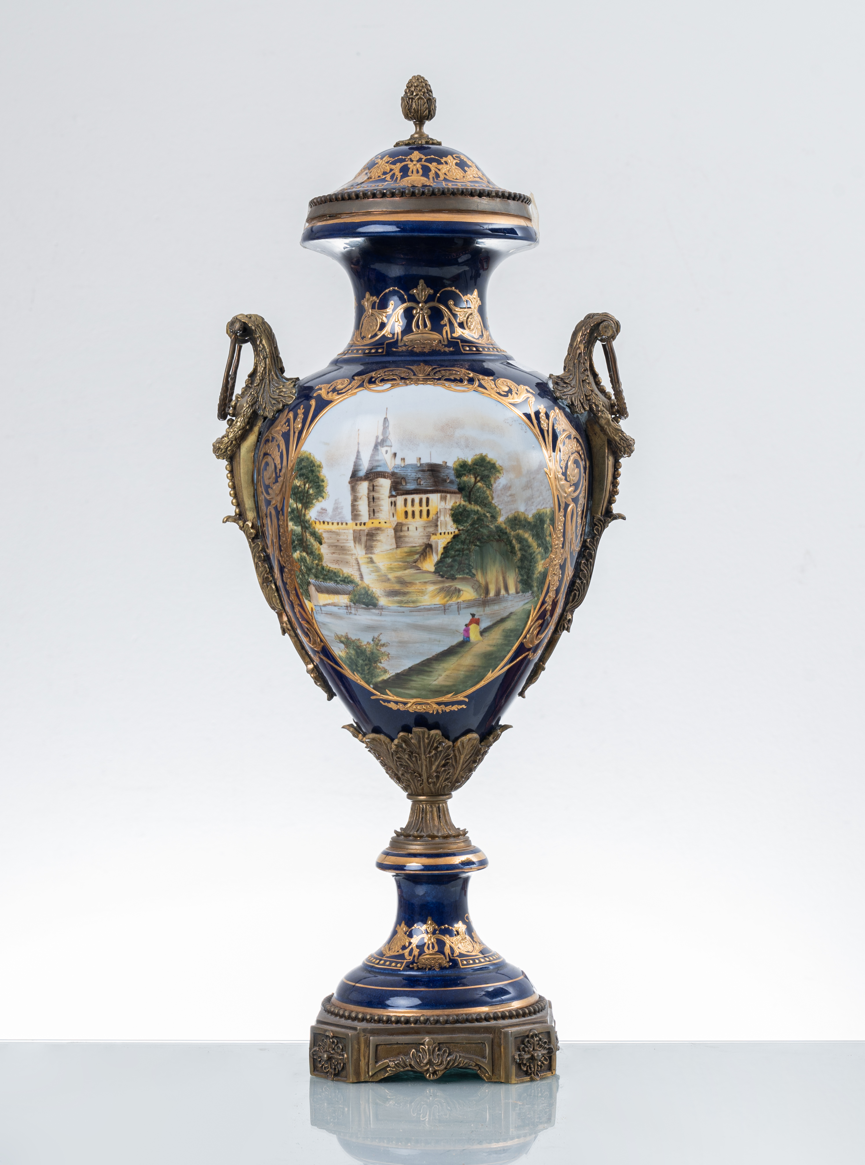 Potiche in porcellana di Sevres decorata e dipinta, medaglioni centrali raffiguranti "Paesaggi con castelli", guarniture e basi in bronzo.