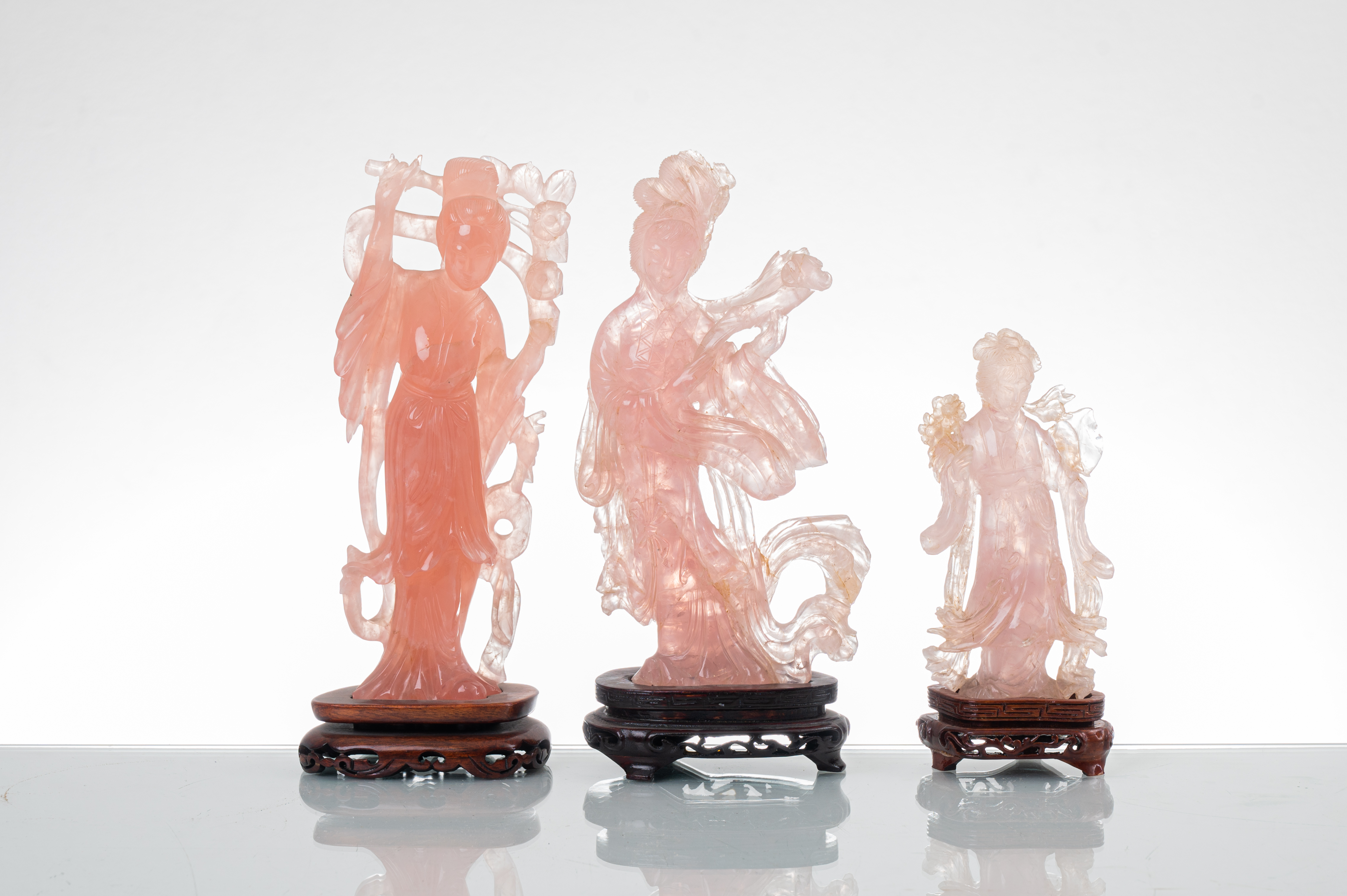 Tre sculture in quarzo rosa raffiguranti "Geishe", basi in legno (usure).