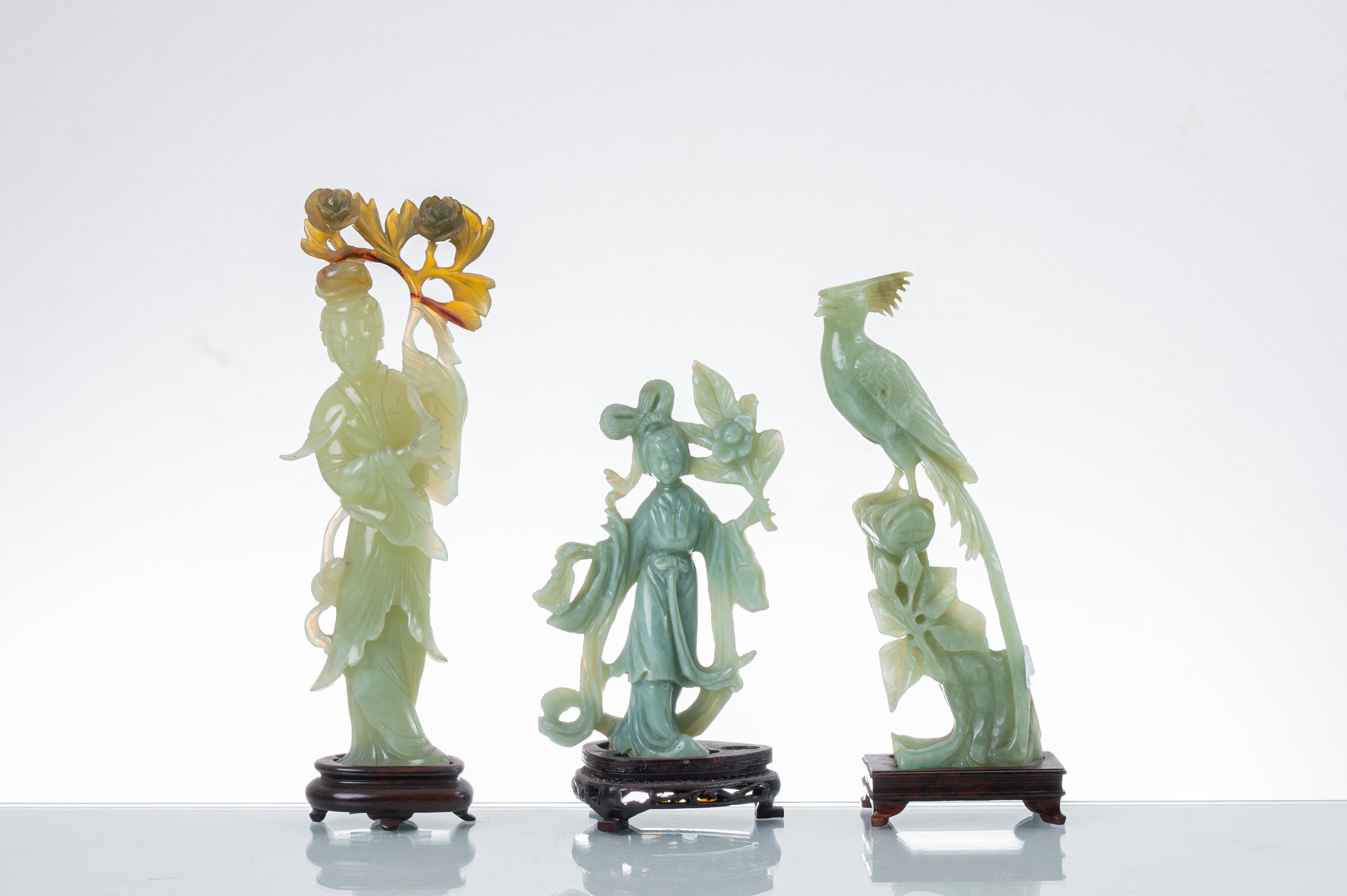 Tre sculture in giada di cui due raffiguranti "Geisha" ed una raffigurante "Volatili", basi in legno (usure).