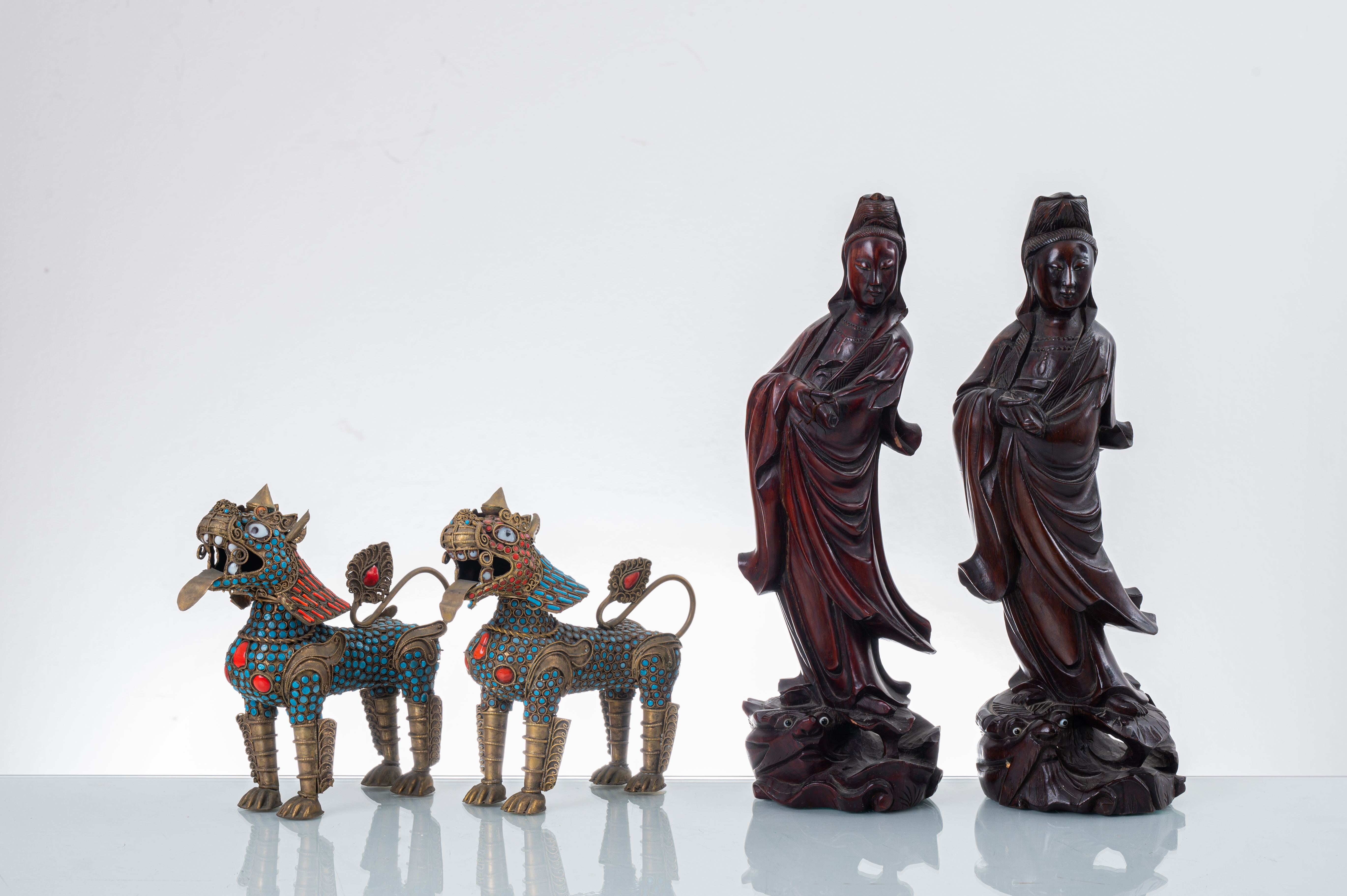 Coppia di sculture in metallo raffiguranti "Cani di Pho" e coppia di sculture in legno raffiguranti "Guanyin".