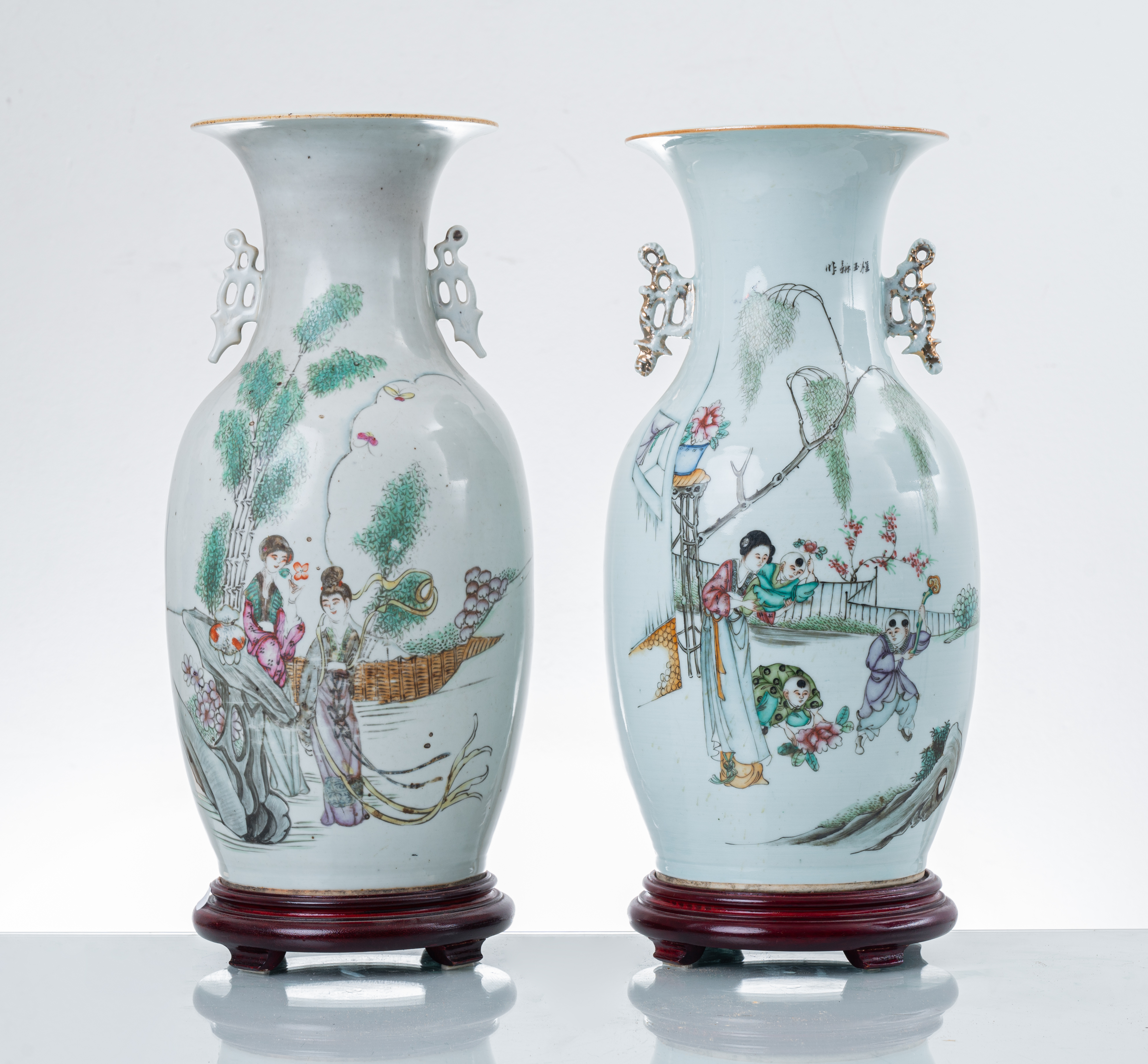 Coppia di vasi in porcellana decorata e dipinta raffiguranti "Personaggi e paesaggi", basi in legno.