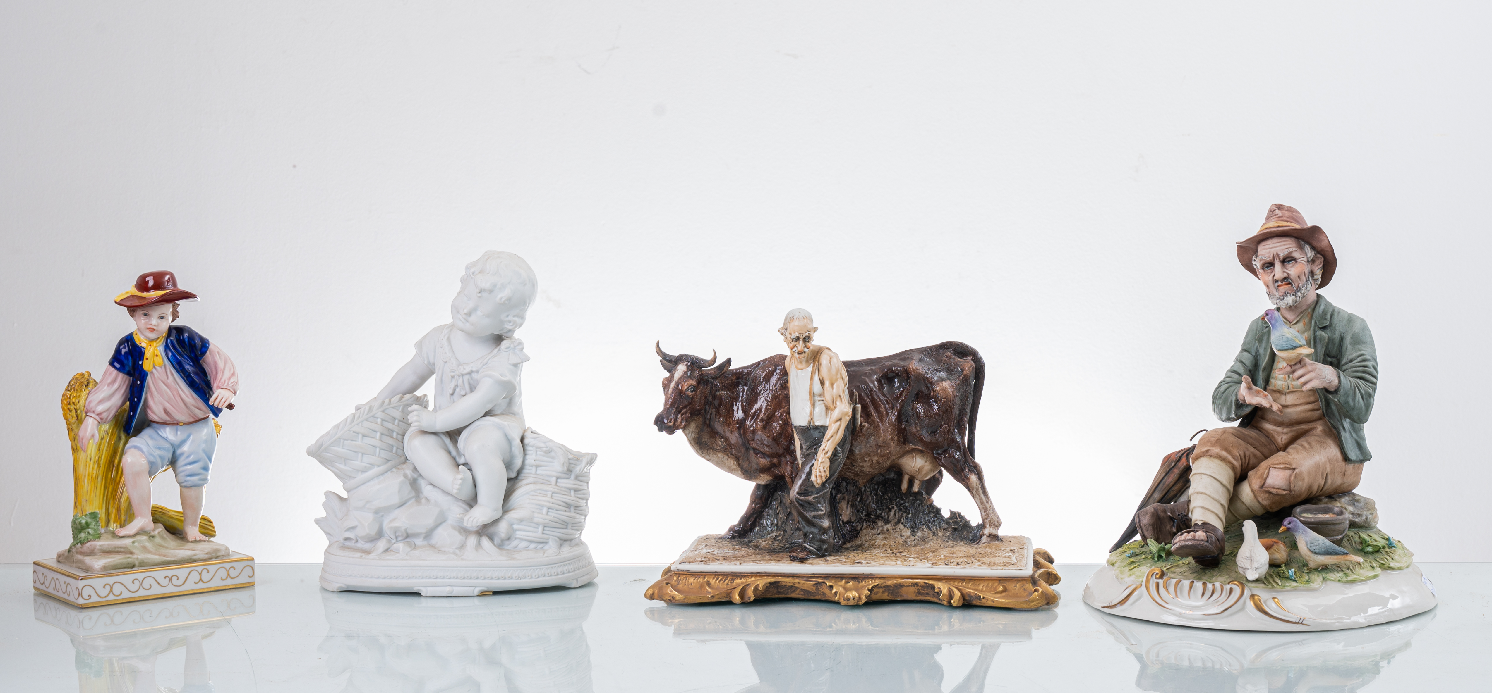 Tre sculture in porcellana decorata e dipinta raffiguranti "Pastore con mucca", "Anziano con colombi" e "Fanciullo con pannocchie" e fioriera in biscuit con scultura raffigurante "Bambino" (usure e mancanze).