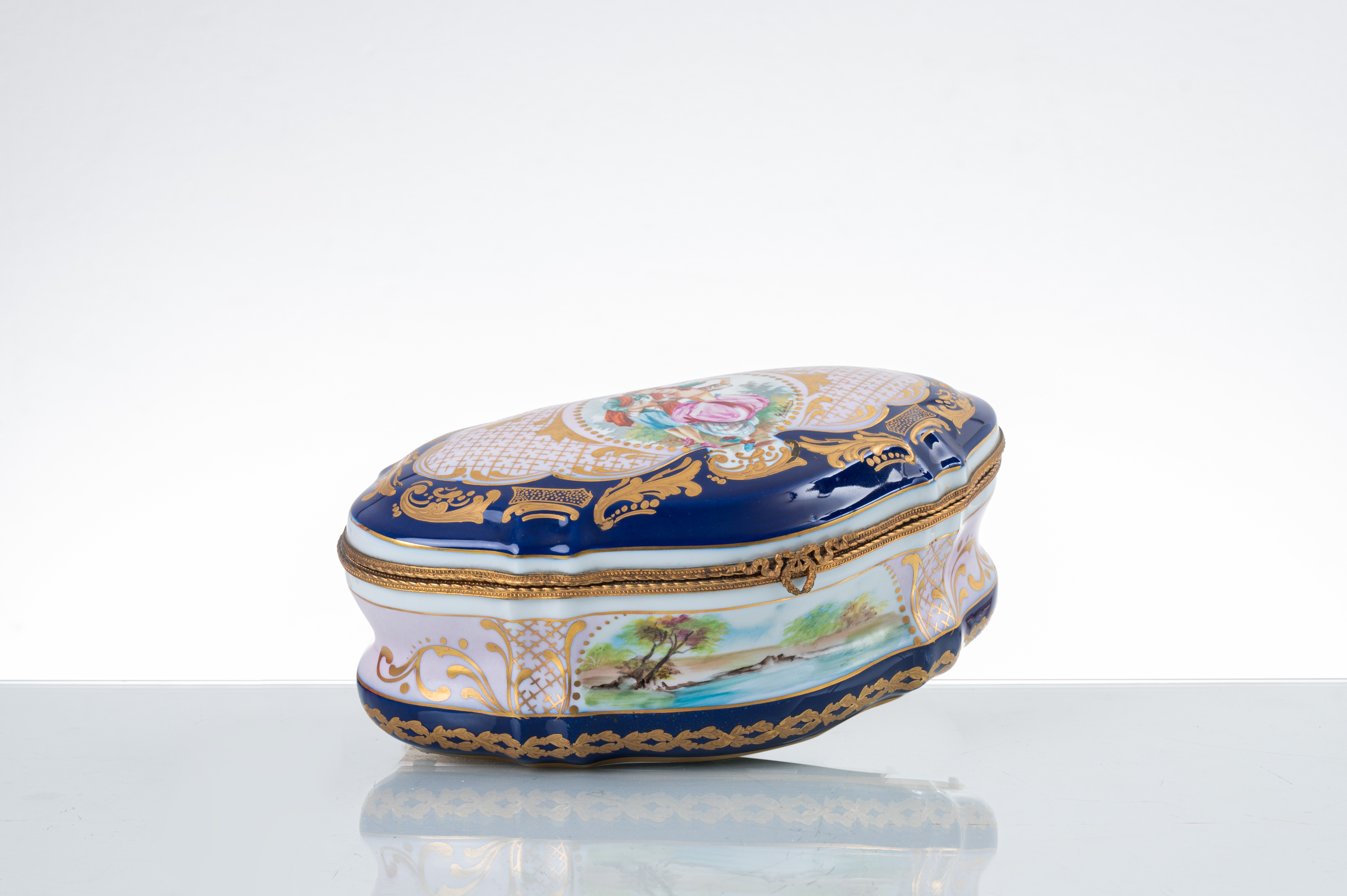 Portagioie in porcellana di Sevres decorata e dipinta, lumeggiature in oro.