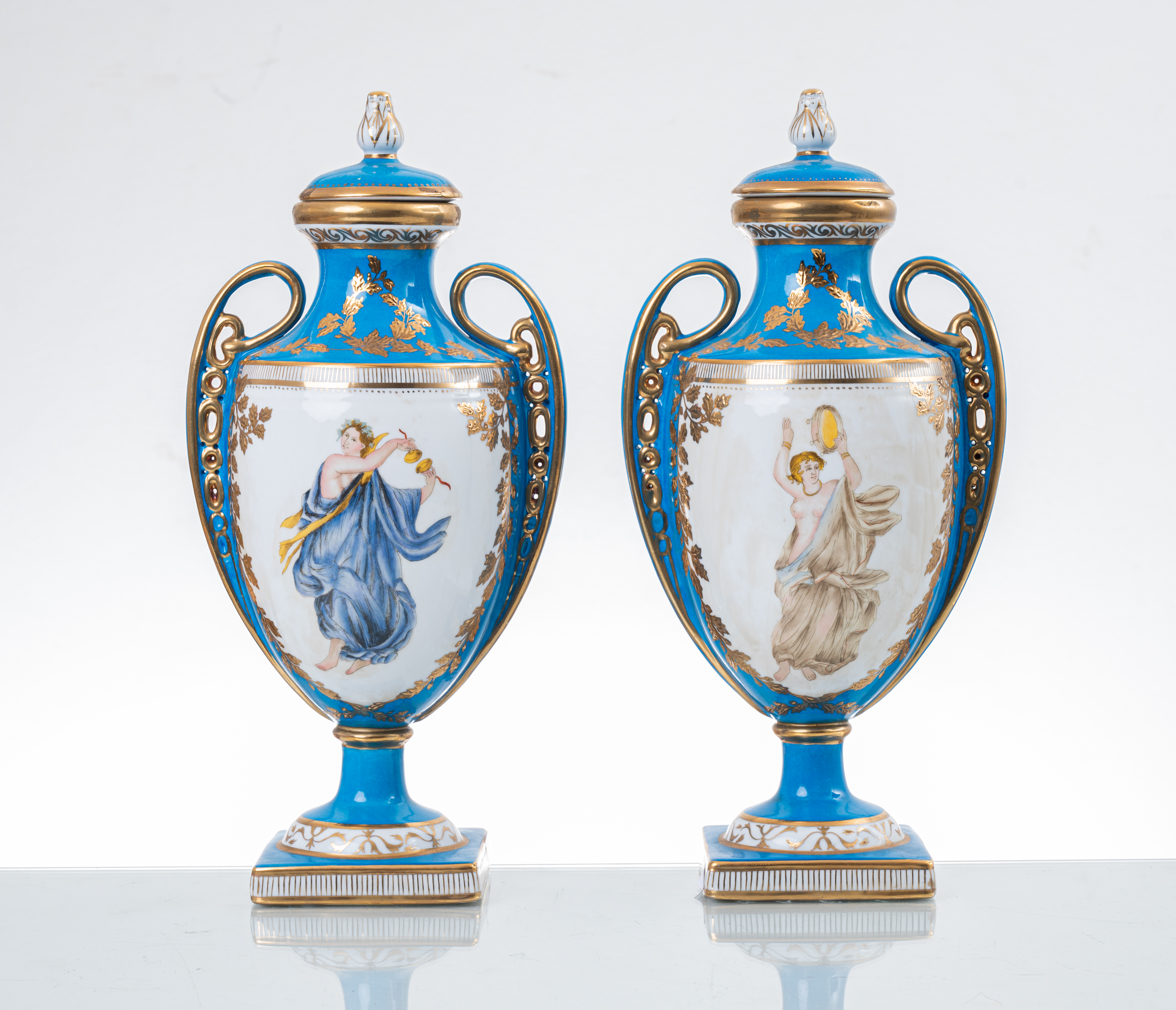Coppia di potiche in porcellana decorata e dipinta, lumeggiature in oro, medaglioni centrali raffiguranti "Figure neoclassiche".