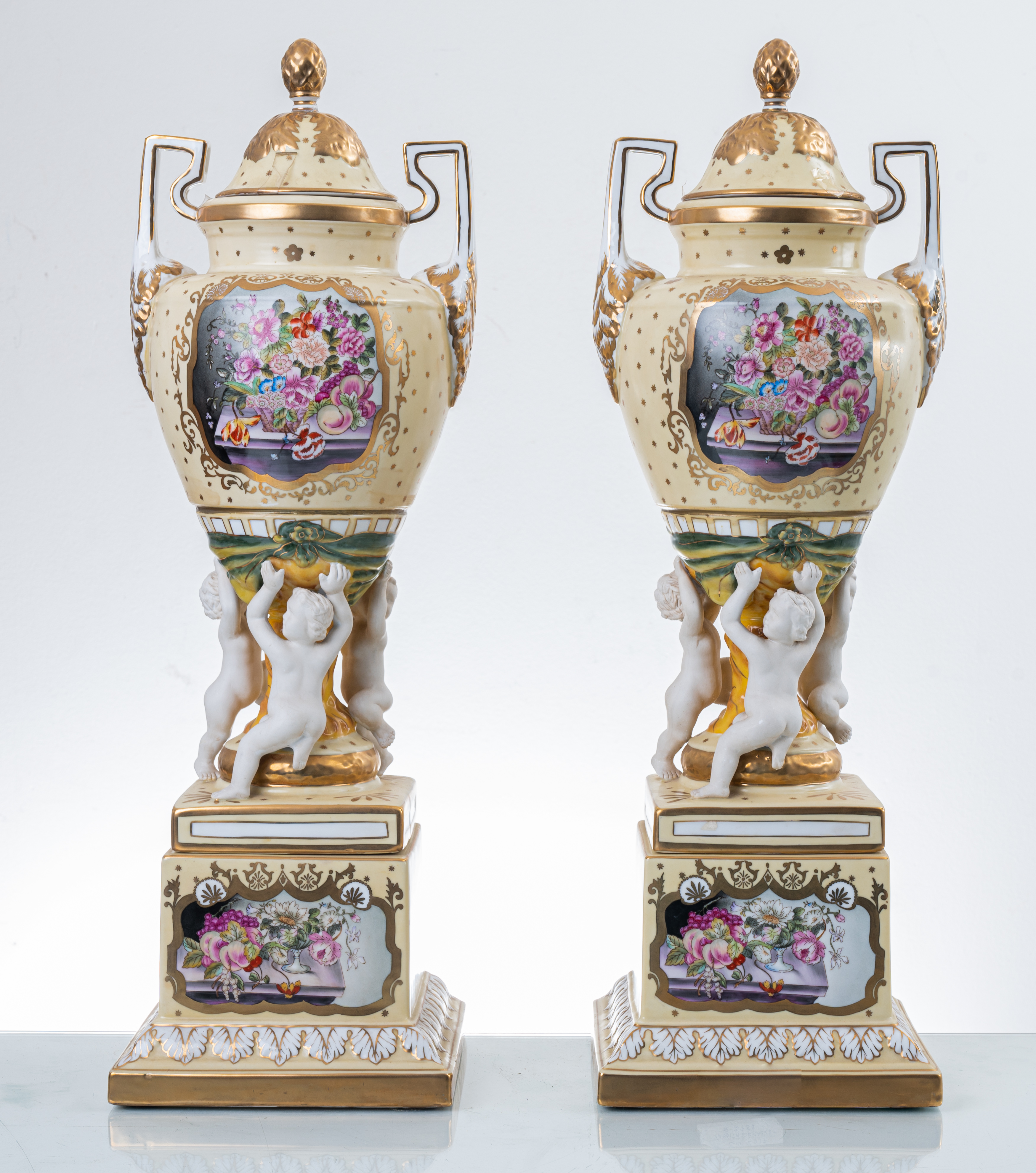 Coppia di potiche in porcellana decorata e dipinta, medaglioni centrali raffiguranti "Fiori e frutta", sorrette da putti in biscuit, lumeggiature in oro.