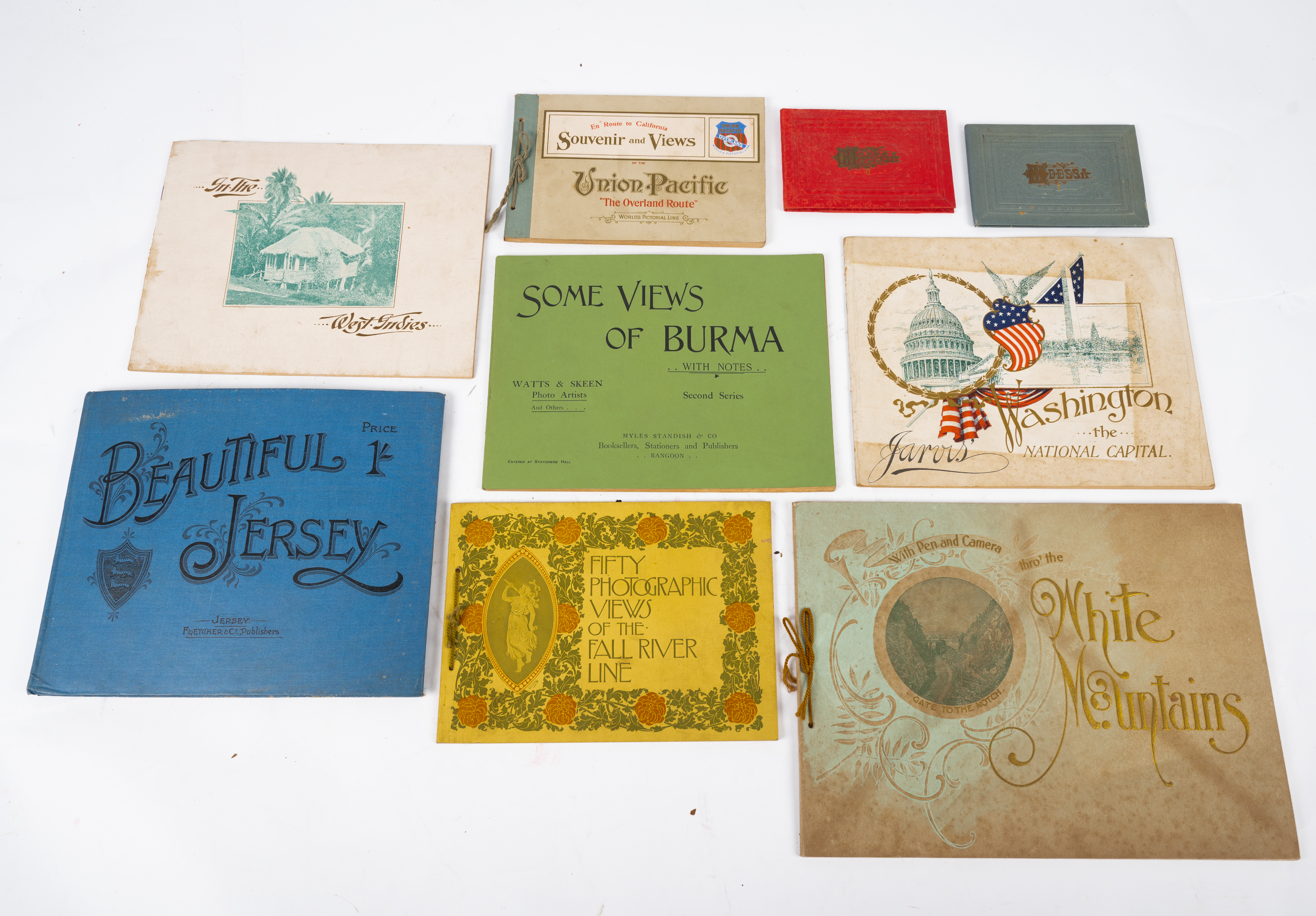NOVE GUIDE TURISTICHE E FOTOGRAFICHE INTERNAZIONALI DELLA FINE DEL XIX SECOLO: 1) N. 2 Album ODESSA, ed. Emil Berndt / Emil Pinkau, Leipzig, s. d. ( ma 1890 circa). Eleganti legature editoriali in piena percallina rigida con impressioni a secco e impressione in oro del nome della città. 2 guide fotografiche di Odessa suddivise in Parte I e II. Rare a trovarsi. Fotografie in b/n. Cm 9 x 13,5. In ottime condizioni. 2) FIFTY PHOTOGRAPHIC VIEWS OF THE STEAMERS OF THE FALL RIVER LINE, ed. John F. Murphy, Boston 1895. Cm 16,5 x 22,5. Brossura editoriale figurata a colori con cordoncino editoriale. In perfette condizioni. Pp. 48. 3) IN THE WEST INDIES, ed. J. Murray Jordan, Philadelphia 1897. Brossura editoriale illustrata. In ottime condizioni. Cm. 20 x 25,5. Pagine n. n. 4) WASHINGTON THE NATIONAL CAPITAL, ed. J. Murray Jordan 1897. Bella brossura editoriale illustrata e figurata a colori. Volume in perfette condizioni. Cm. 20 x 26. Pagine n. n. 5) WHIT PEN AND CAMERA THRO’ THE WHITE MOUNTAINS, ed. Chisholm Bros. Portland 1896. Bella brossura editoriale illustrata con titoli istoriati in oro. 46 fotografie e testi sulle White Mountains del New Hampshire. Fotografie di Henry G. Peabody. Testo di Holman D. Waldron. Pubblicato da Chisholm Brothers. Stampato da Willey and Allen. Copertina verde con legatura a due fori in cordoncino. La coperta include una piccola immagine rotonda del “Gate to the Notch”. Cm 23,5 x 32. 6) UNION PACIFIC “ THE OVERLAND ROUTE”, ed. World Pictorial Line s. d. ( ma 1899 circa). volume fotografico in perfette condizioni. Cm 13 x 20. In perfette condizioni. Raro a trovarsi. Pp. 74. 7) BEAUTIFUL JERSEY, ed. Jersey, Fletcher & Co. 1899. Legatura editoriale in piena tela rigida figurata. Cm 22 x 26. In ottime condizioni. Pagine n. n. con alcune tavole più volte ripiegate. Raro a trovarsi. 8) SOME VIEWS OF BURMA, ed. Myles Standish & Co., Rangoon s. d. ( ma 1898/99 circa) Second Series. Brossura editoriale. In perfette condizioni. Cm 19 x 25. Pp. 53.