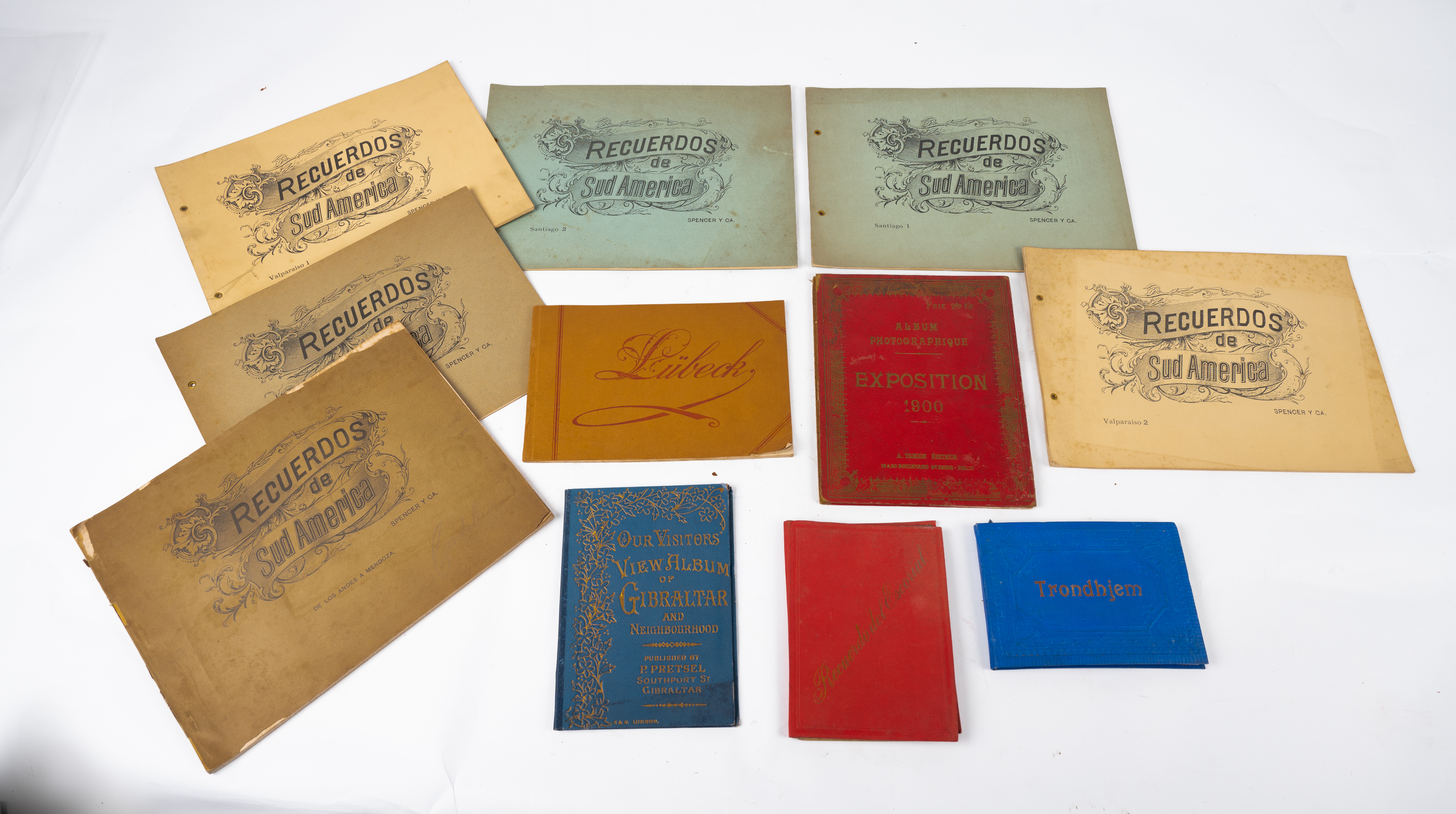 UNDICI GUIDE FOTOGRAFICHE INTERNAZIONALI DEGLI INIZI DEL XX SECOLO: 1) TRONDHJEM, A. Holbaek Eriksen, s. d. ( ma 1906-1910). Elegante legatura editoriale in piena percallina rigida con impressioni a secco e impressione in oro del nome della città. In ottime condizioni. Cm 12 x 16. 2) RECUERDO DEL ESCORIAL, ED. c. Huerta, Escorial s. d. ( ma 1920 circa). Legatura editoriale in piena percallina rigida con impressione in oro del nome della città al piatto anteriore e cornice fregiata in oro al piatto posteriore. Cm 17 x 12. 3) OUR VISITORS VIEW ALBUM OF GIBRALTAR AND NEIGHBOURHOOD, published by P. Prestel, Southport St. Gibraltar, E & S. London, s. d. ( ma 1905 circa). Elegante legatura editoriale in piena percallina rigida con eleganti impressioni in oro. Rara a trovarsi. Cm 19 x 13,5. 4) ALBUM PHOTOGRAPHIQUE EXPOSITION 1900, ed. Draeger Freres, Paris 1900. Legatura editoriale a cartellina in piena percallina rigida con titoli, e cornice fregiata in oro impressa al piatto. In buone condizioni. Contiene 18 fotografie in b/n. 5) ALBUM VON LUBECK. 14 TAFELN MIT 32 ANSICHTEN, ed. von Joh. Nohring, Lubeck s. d. brossura editoriale. Volume in ottime condizioni. Cm 15 x 23. Pagine non numerate (15). 12) 15) 2 Album RECUERDOS DE SUD AMERICA, SANTIAGO 1 e SANTIAGO 2, ed. Spencer Y Ca. s. d. Rari a trovarsi. Brossure editoriali. In ottime condizioni. Cm 22 x 30. Pagine non numerate. 16) Album RECUERDOS DE SUD AMERICA. COSTUMBRES, ed. Spencer Y Ca. s. d. Rari a trovarsi. Brossura editoriale. In ottime condizioni. Cm 22 x 30. Pagine non numerate. 17) 2 Album RECUERDOS DE SUD AMERICA, VALPARAISO 1 e VALPARAISO 2, ed. Spencer Y Ca. s. d. Brossure editoriali. In ottime condizioni. Cm 22 x 30. Pagine non numerate. 18) RECUERDOS DE SUD AMERICA. DE LOS ANDES A MENDOZA, ed. Spencer Y Ca, s. d. Brossura editoriale. In buone condizioni. Cm 23,5 x 30,5. Pagine non numerate.
